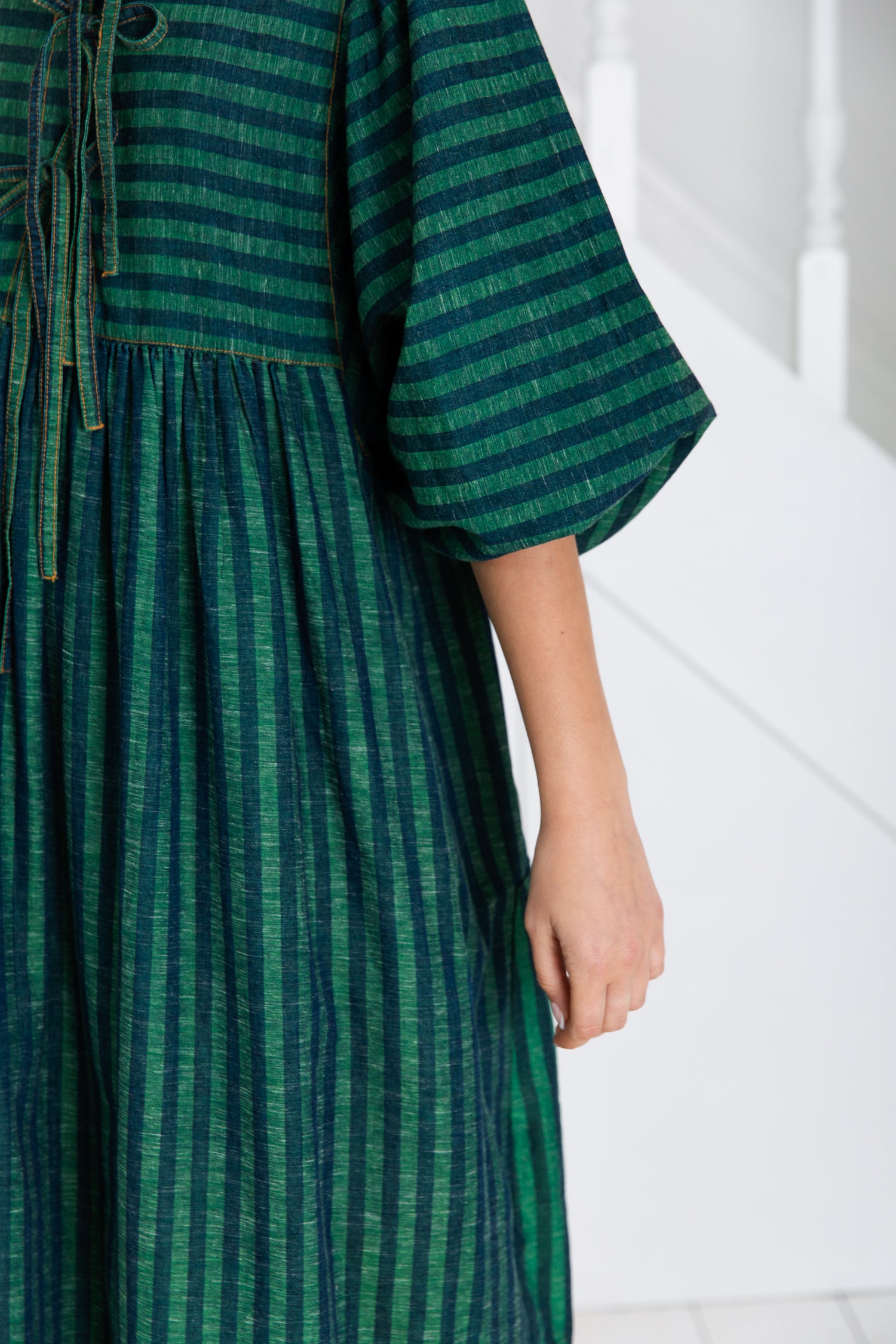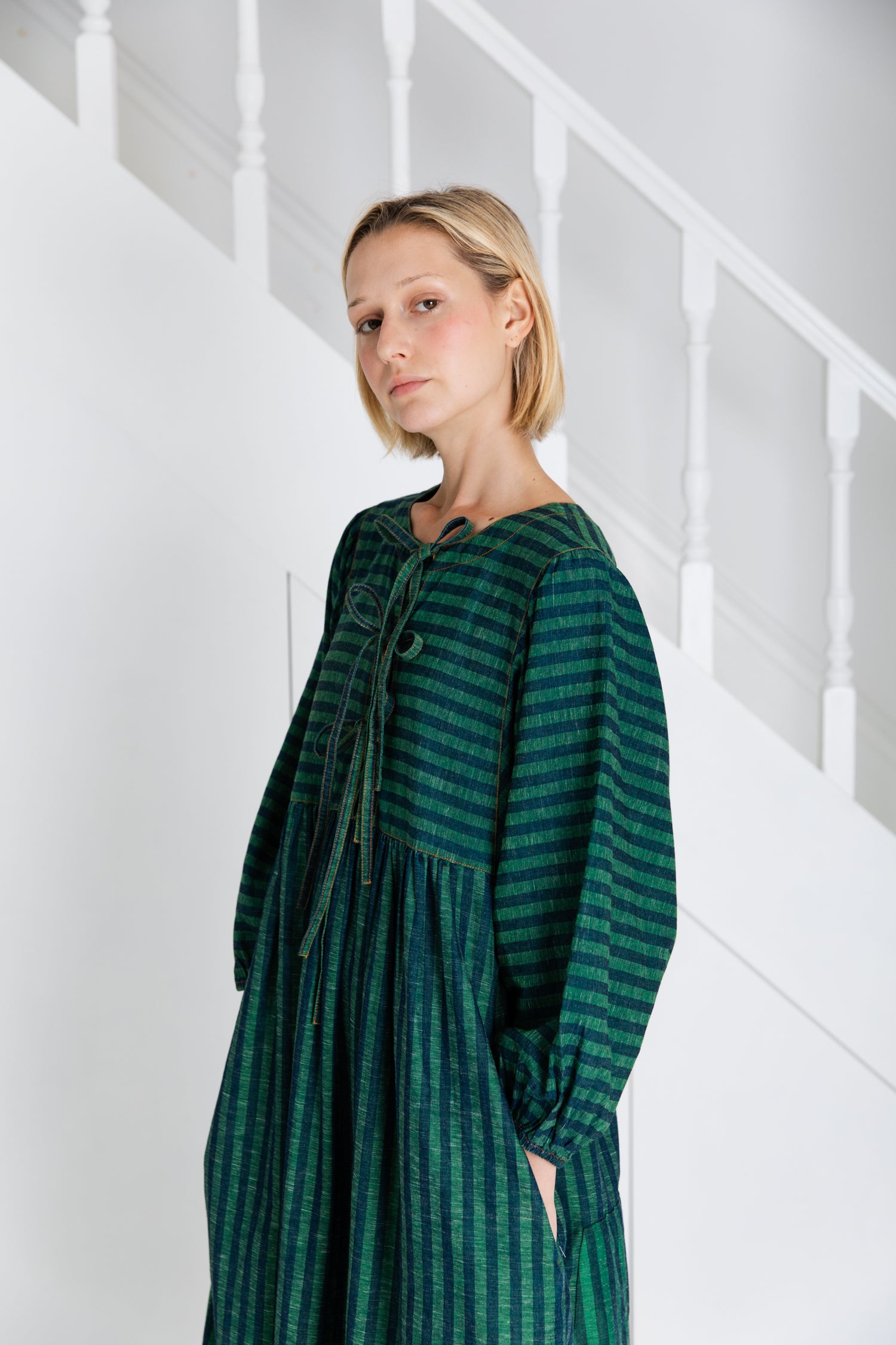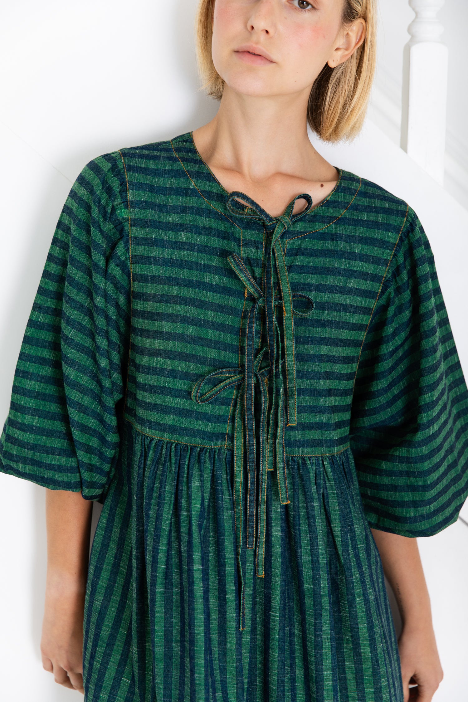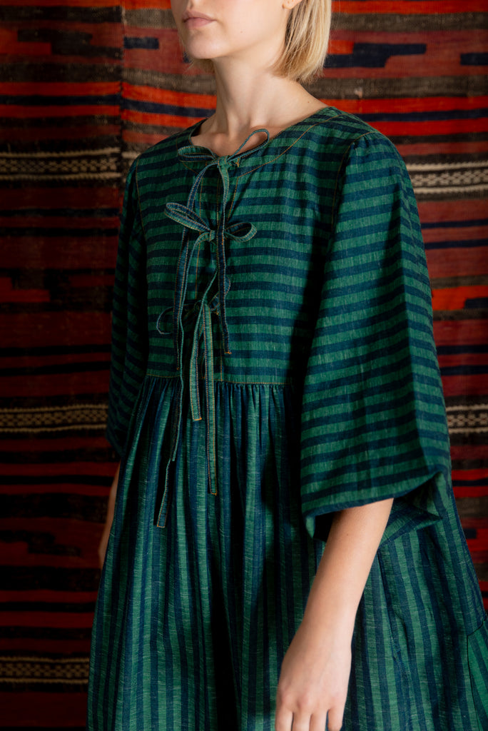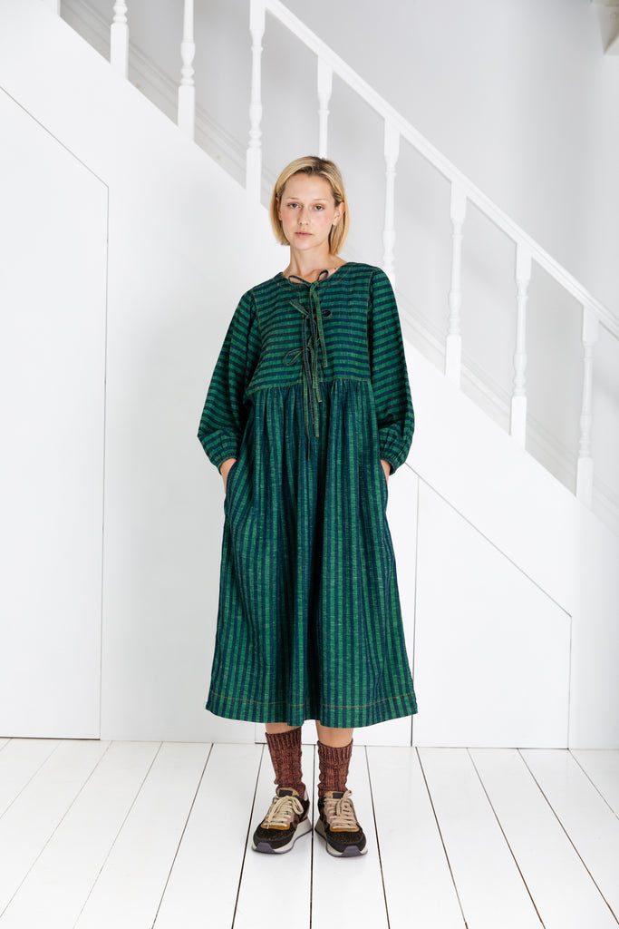 A loose and relaxed easy-fit organic self stripe cotton dress with a statement bow fastening detail and an empire line.