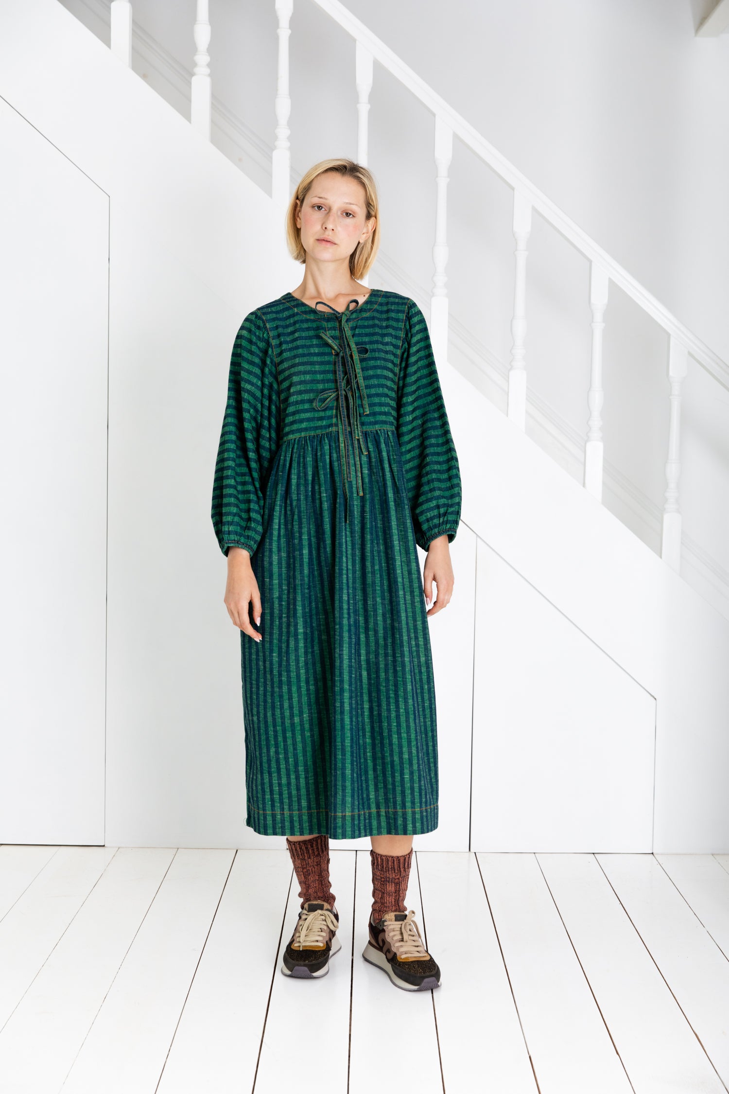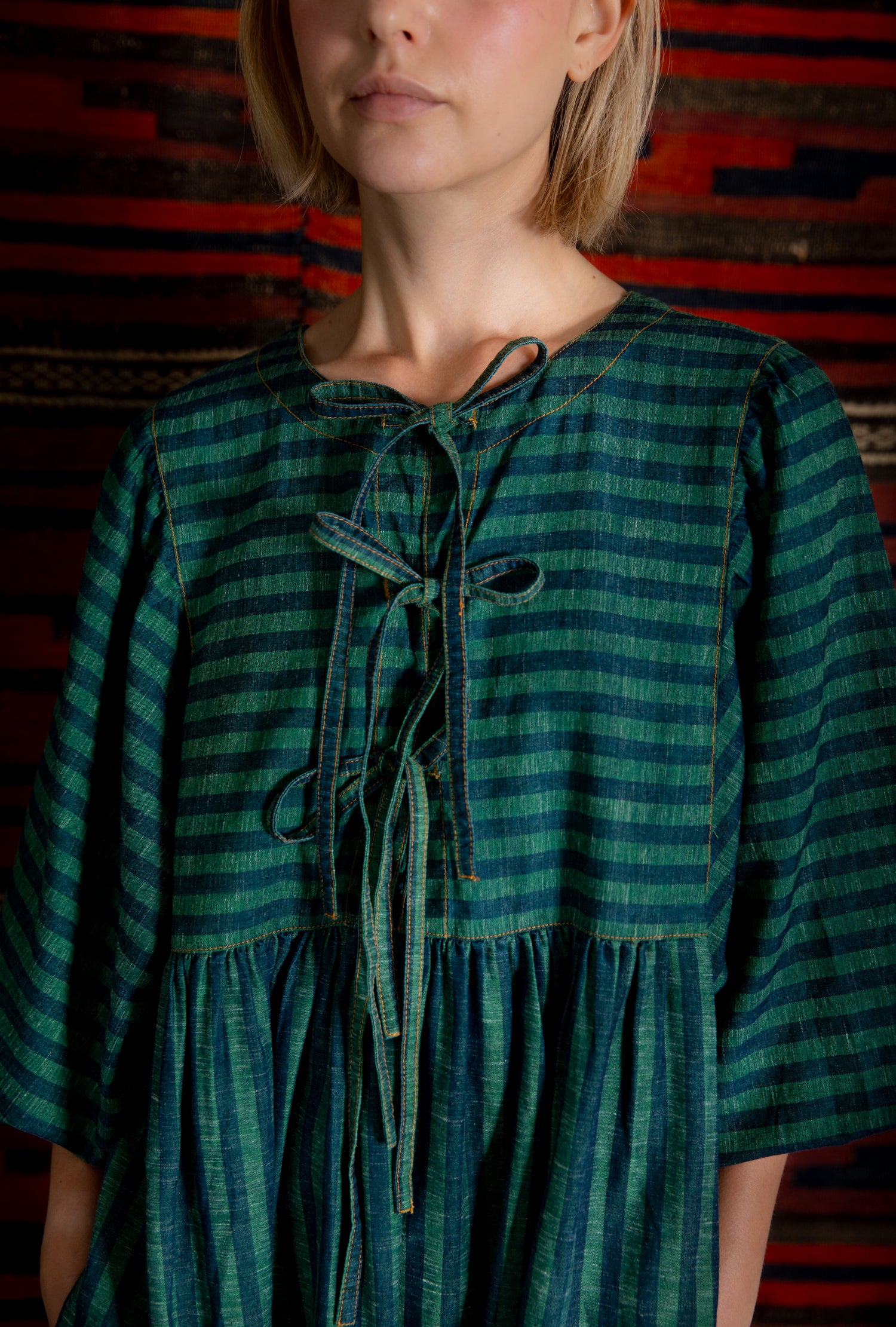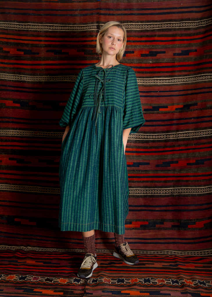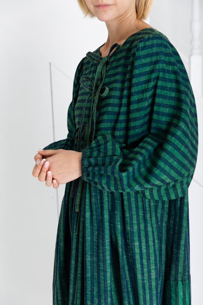 A loose and relaxed easy-fit organic self stripe cotton dress with a statement bow fastening detail and an empire line.