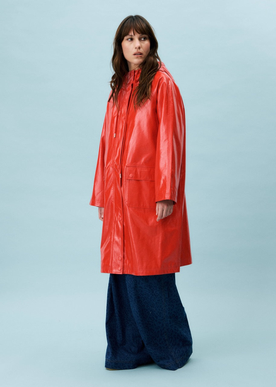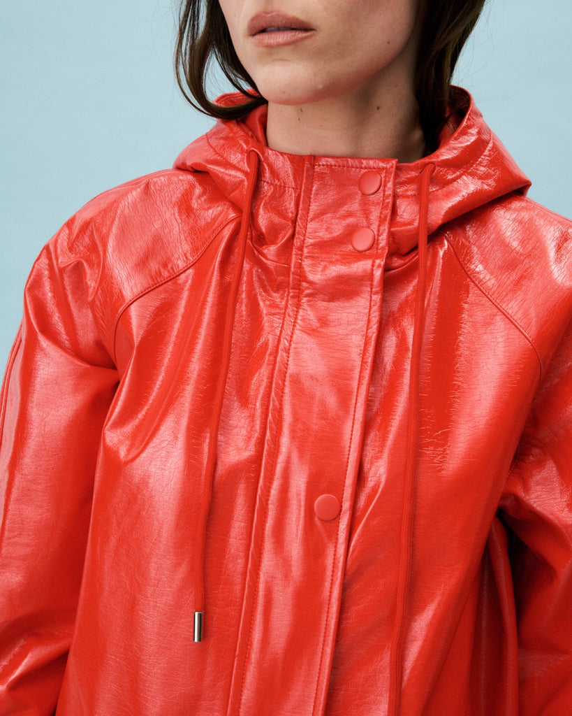 Stunning fire engine red, with a cute hood and front patch pockets.