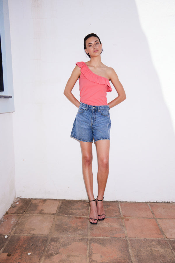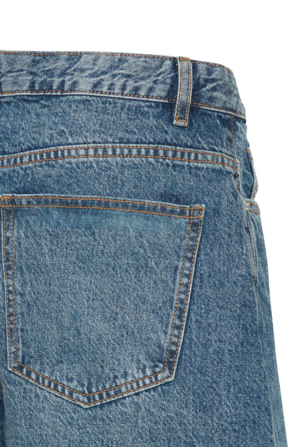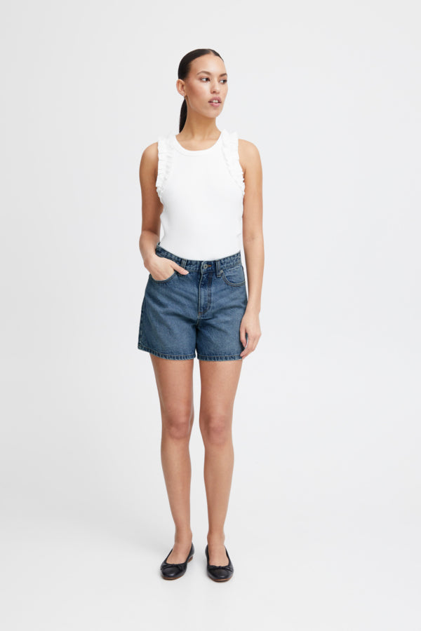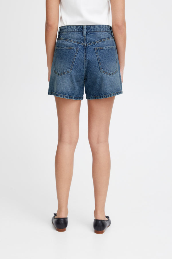 High waisted with a wide, mid/high thigh fit- not soo short!