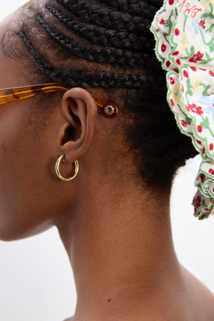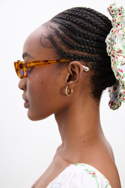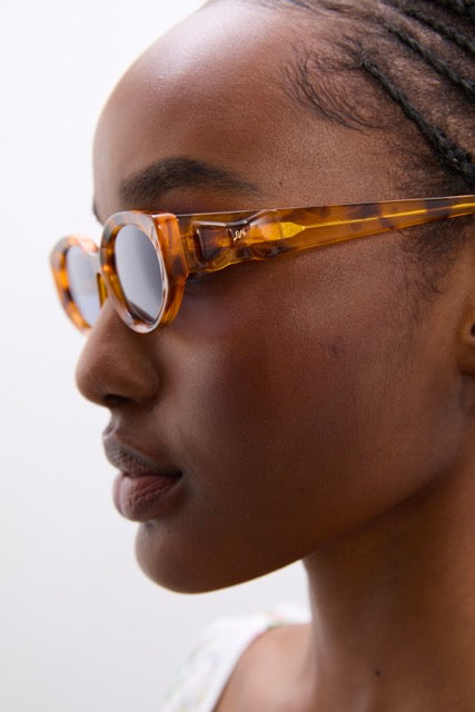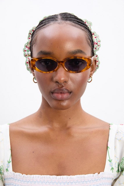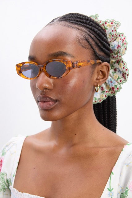 Classic tortoiseshell sunglasses, slim line with a gentle cat eye shape.
