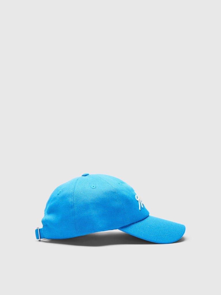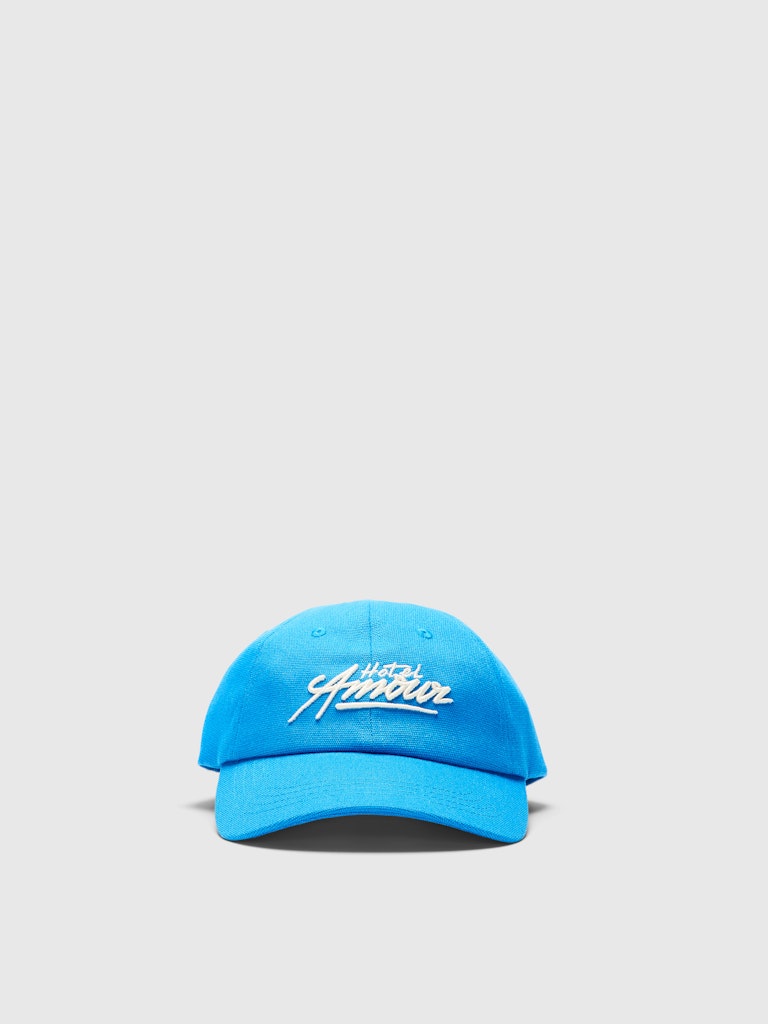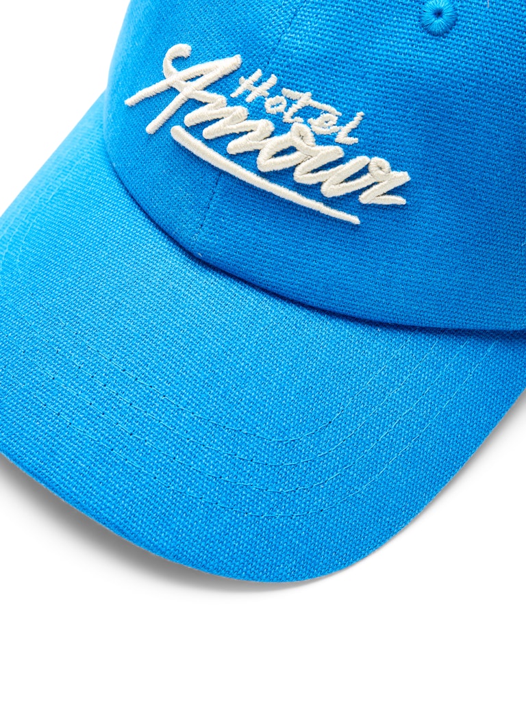 A bright peacock blue cap with 'Hotel Amour' embroidered on the front.
