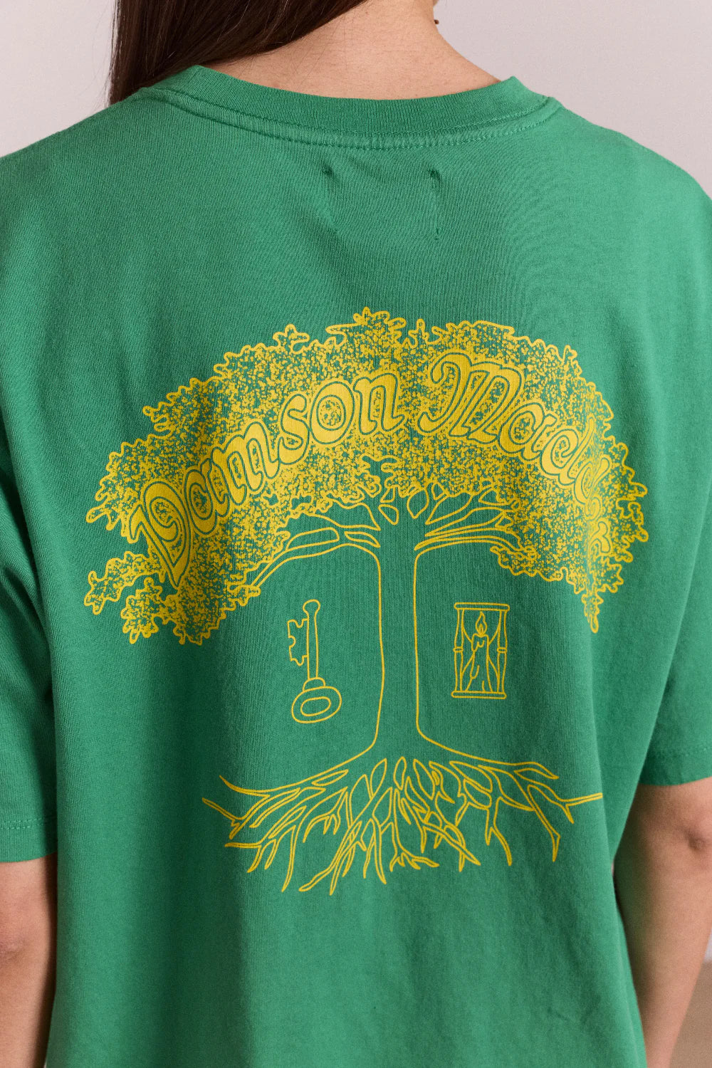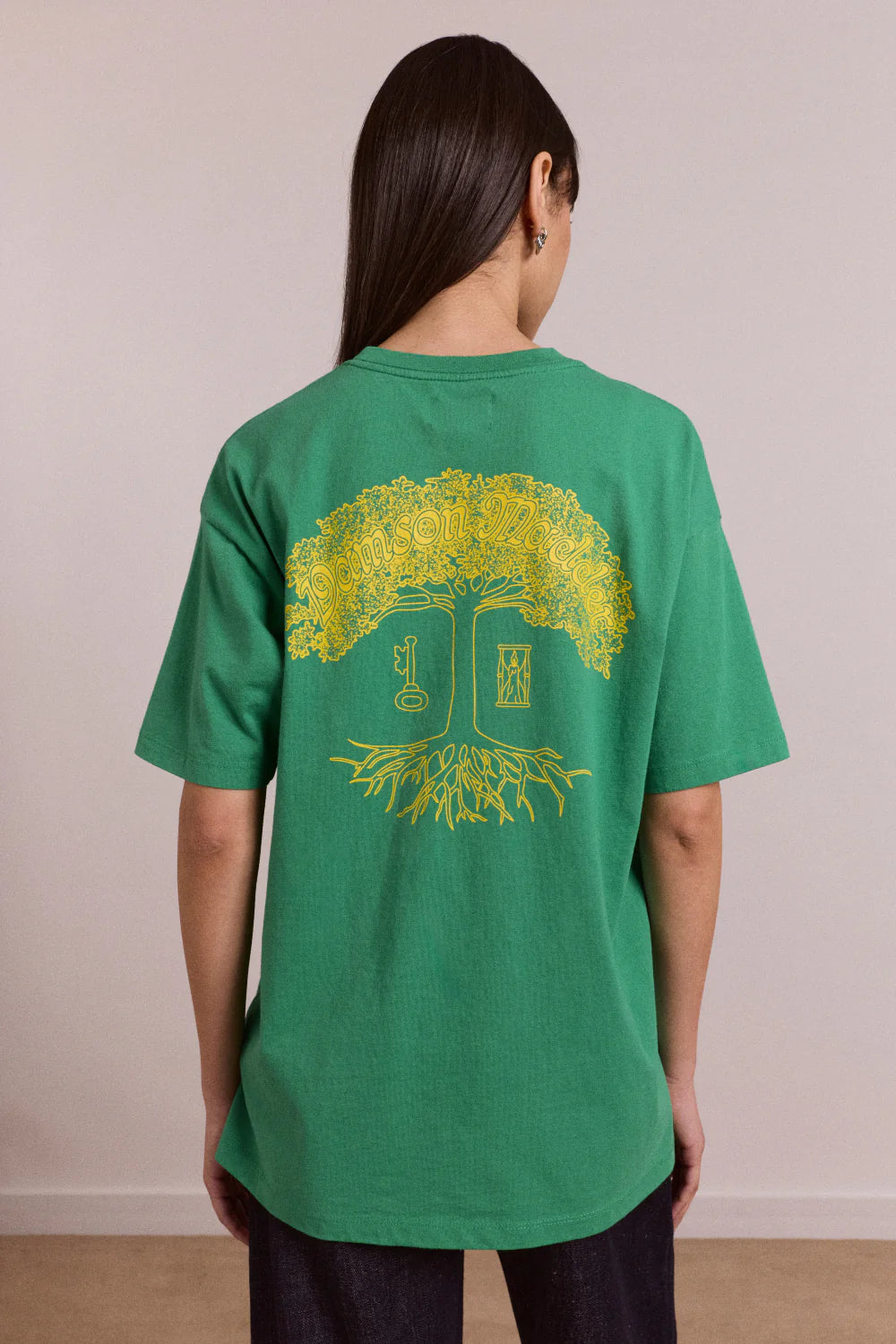 Designed with a relaxed, oversized fit, this tee features thoughtfully placed graphic prints on the front and back for a playful touch.