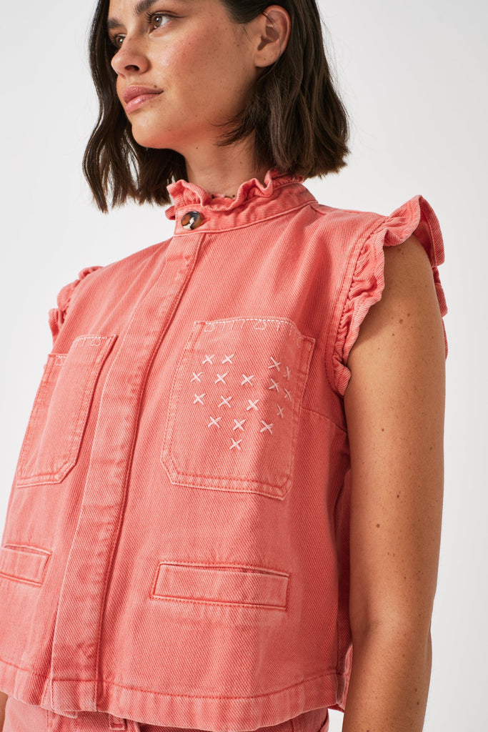 The Seventy + Mochi signature best selling waistcoat, now featuring heart stitch detailing and in a beautiful washed red.
