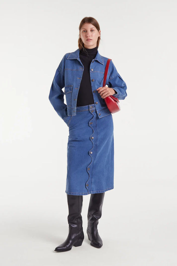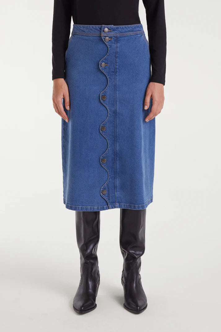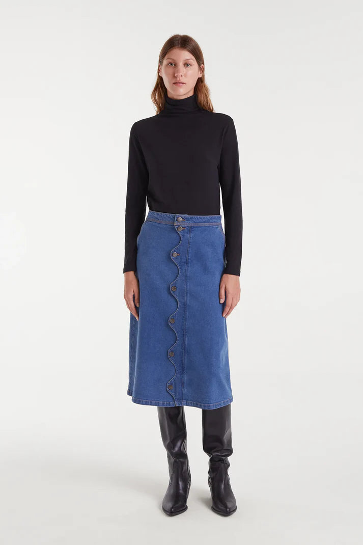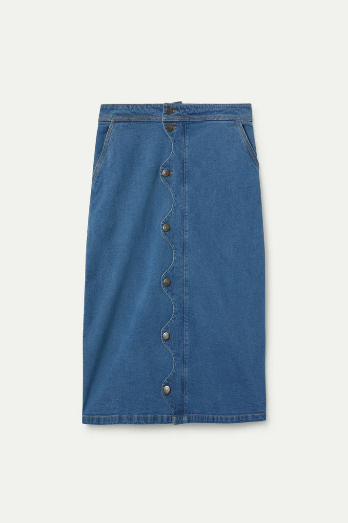 Blue midi skirt with scallop detail.