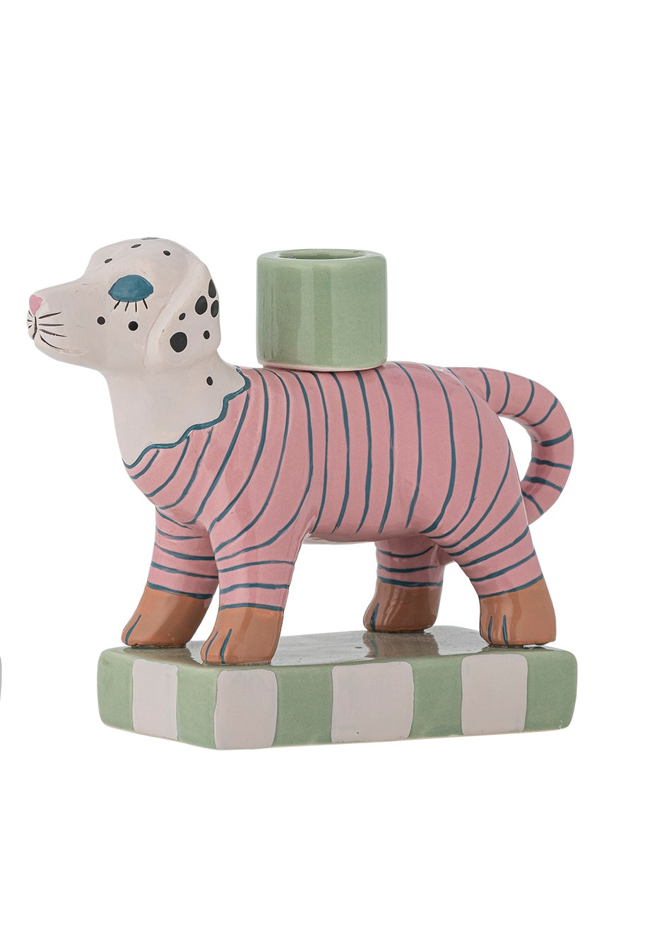 The Doglie Candle Holders by Bloomingville depict whimsical dogs, hand-painted in fanciful colours with dots and stripes in pink, black and blue.