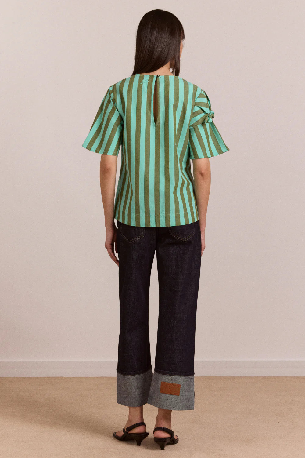 Designed in a relaxed fit with a front body tie and tie detail on the right sleeve, it’s finished with a subtle back keyhole and button fastening at the neck.