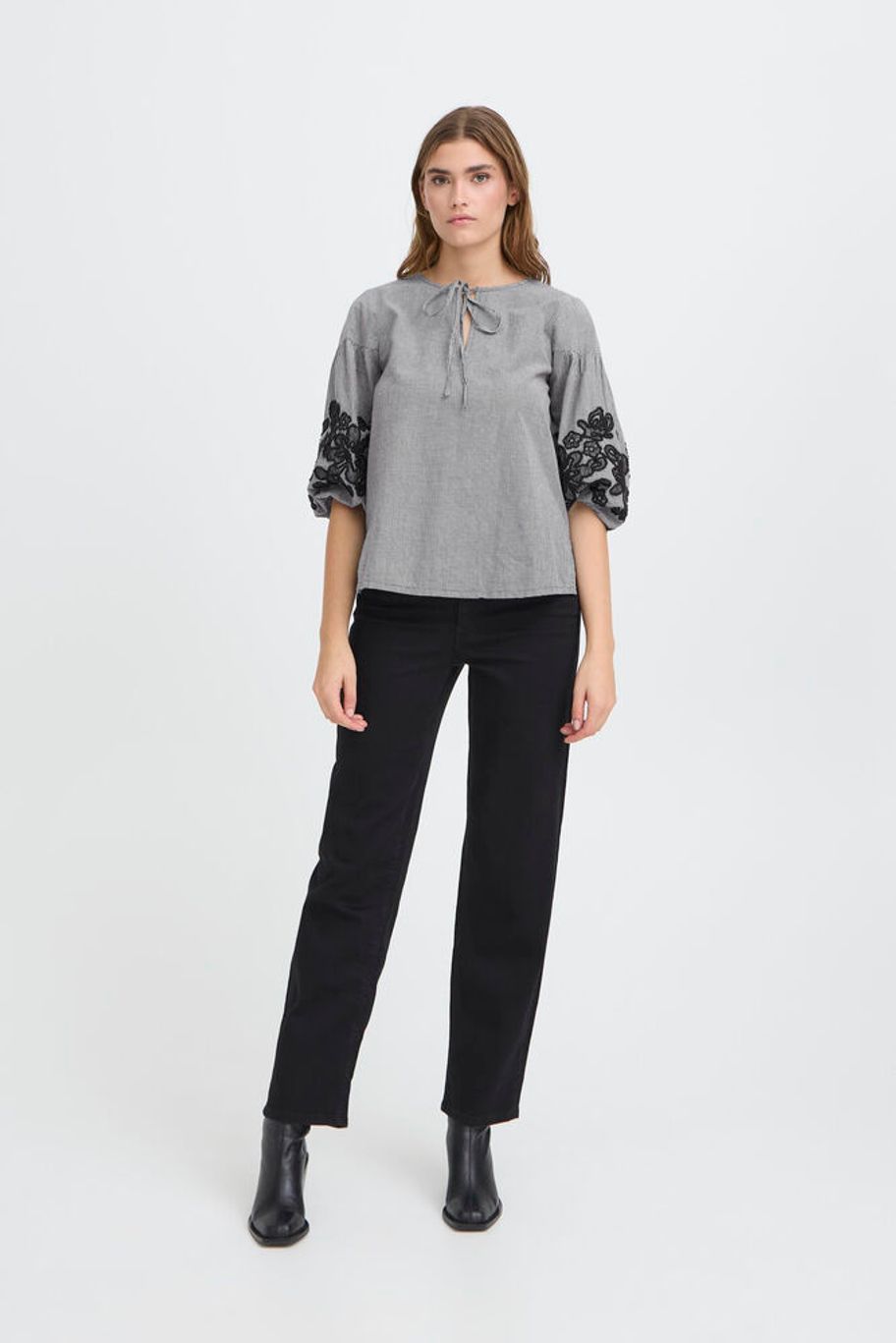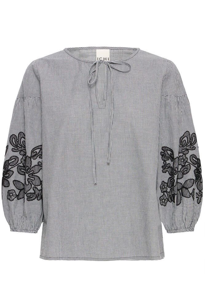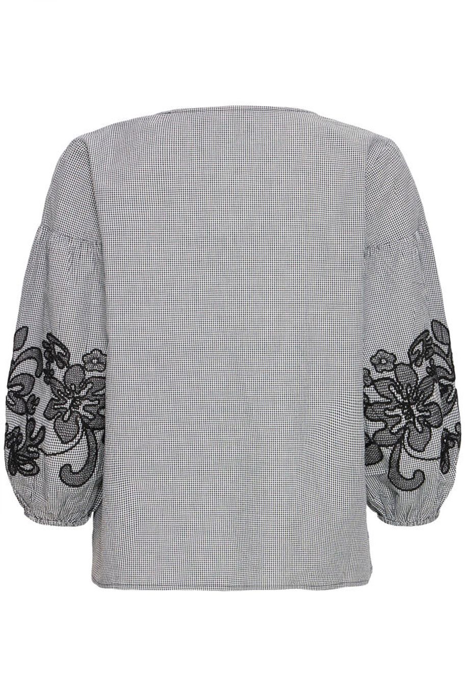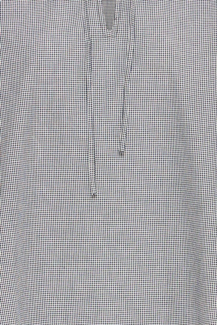 Deepest blue/black mini ginham with contrasting sleeve embroidery.