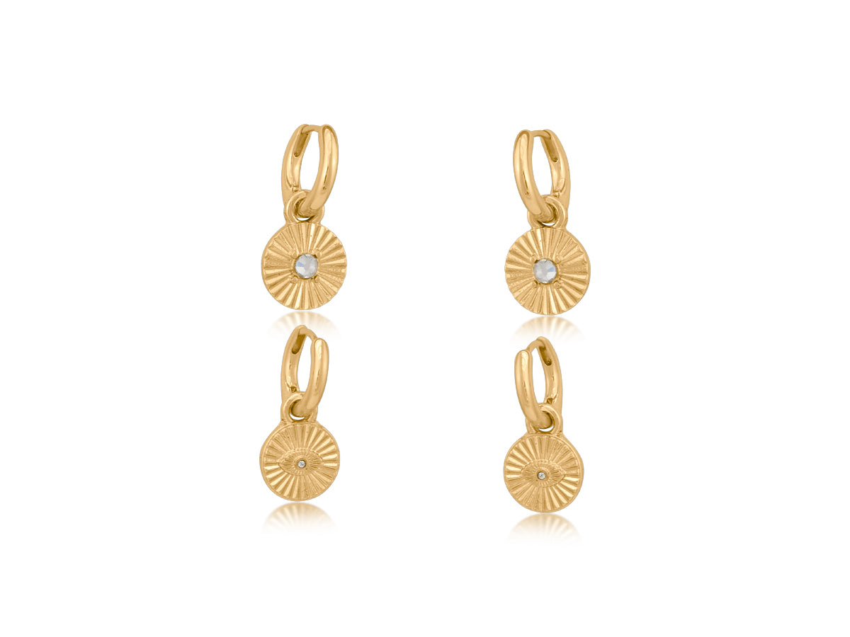 This set of two gold plated huggie earrings features dainty charms and a high shine finish.