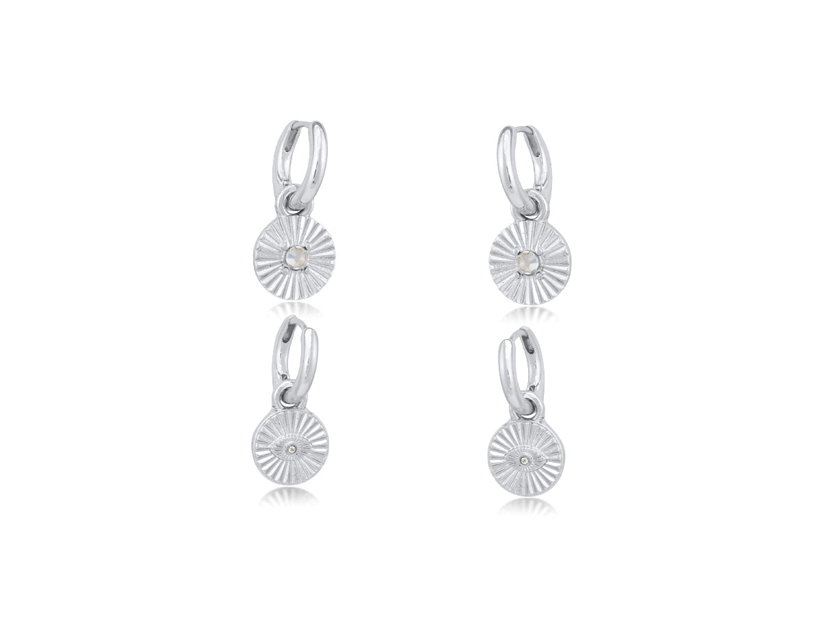 This set of two silver plated huggie earrings features dainty charms and a high shine finish.