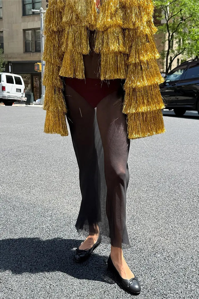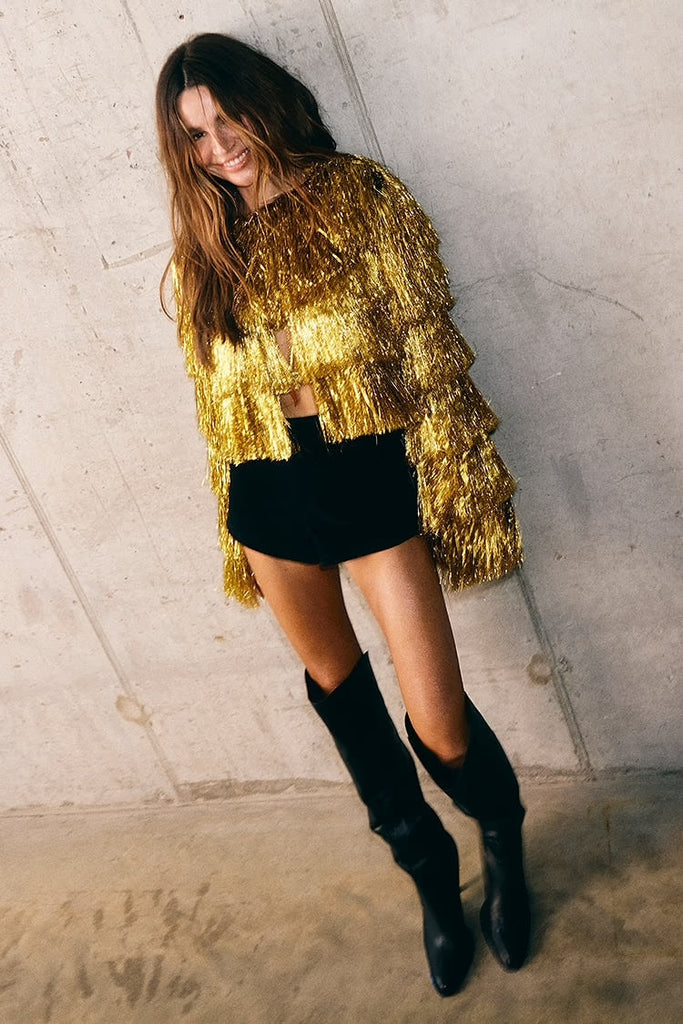Start the party early! With layered tassels, in a stunning gold foil, that move with you catching every flicker of light, it's a definite head turner.