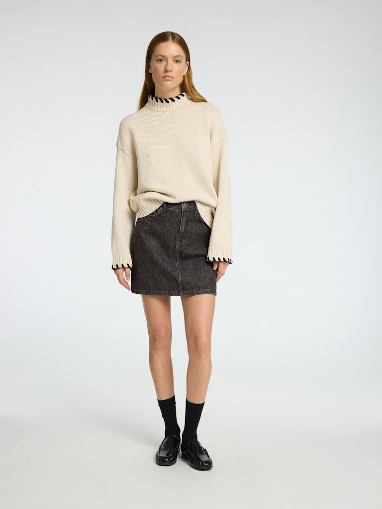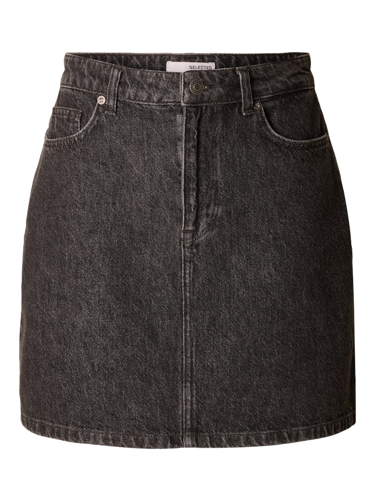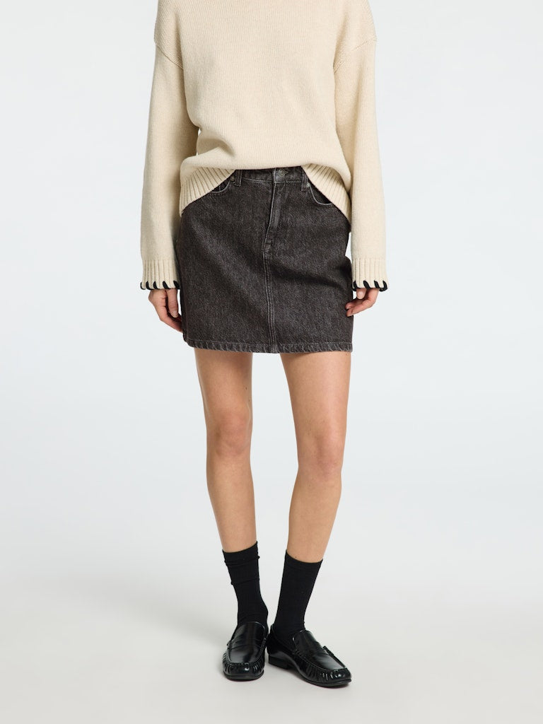 An easy wardrobe staple, this washed black denim skirt can be worn all year round.