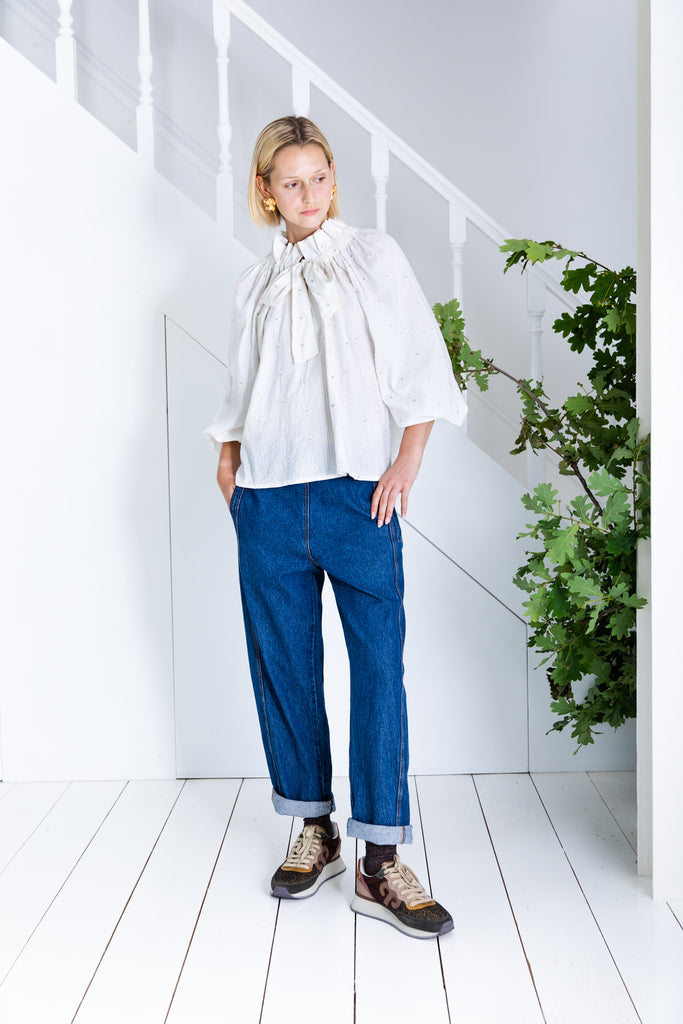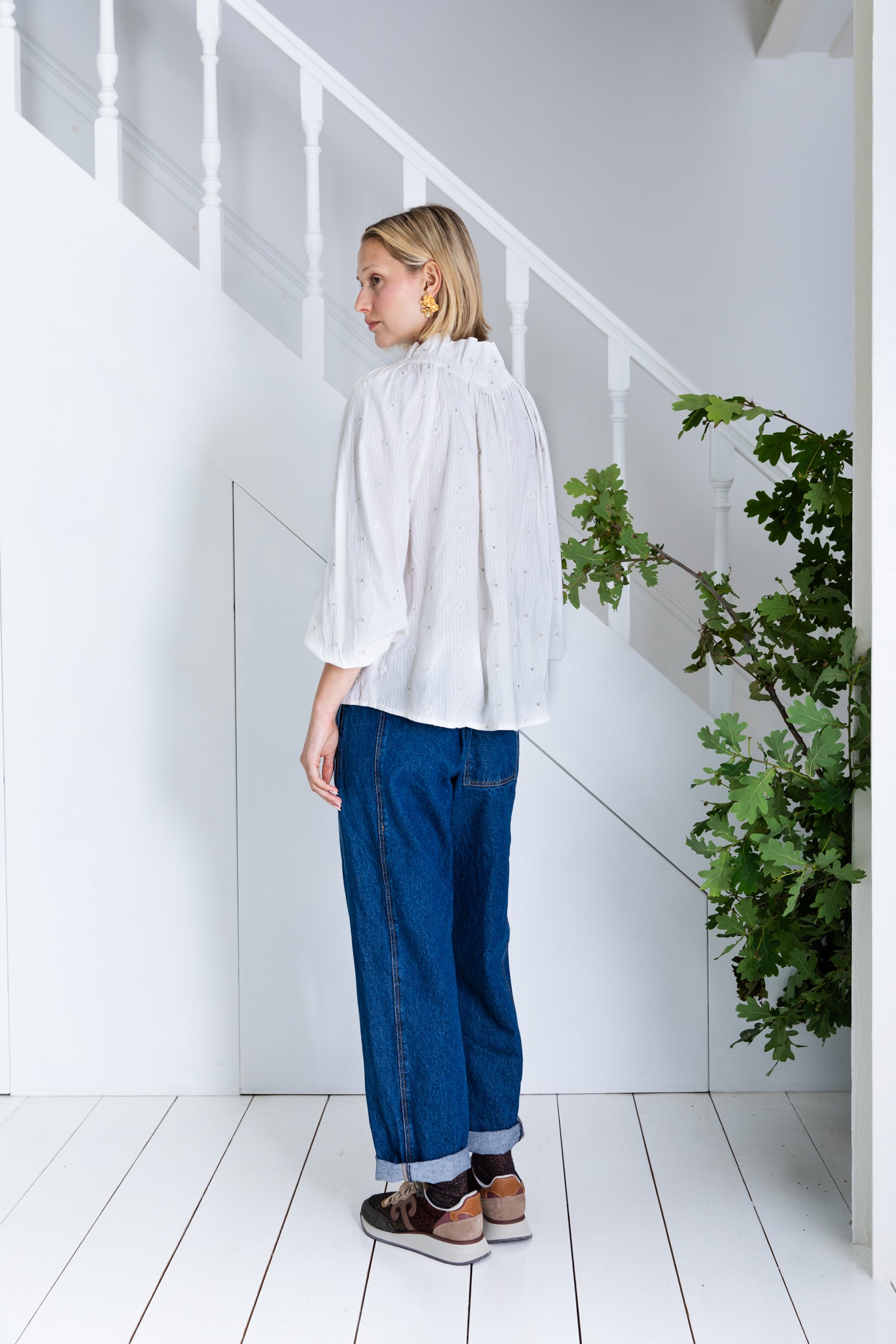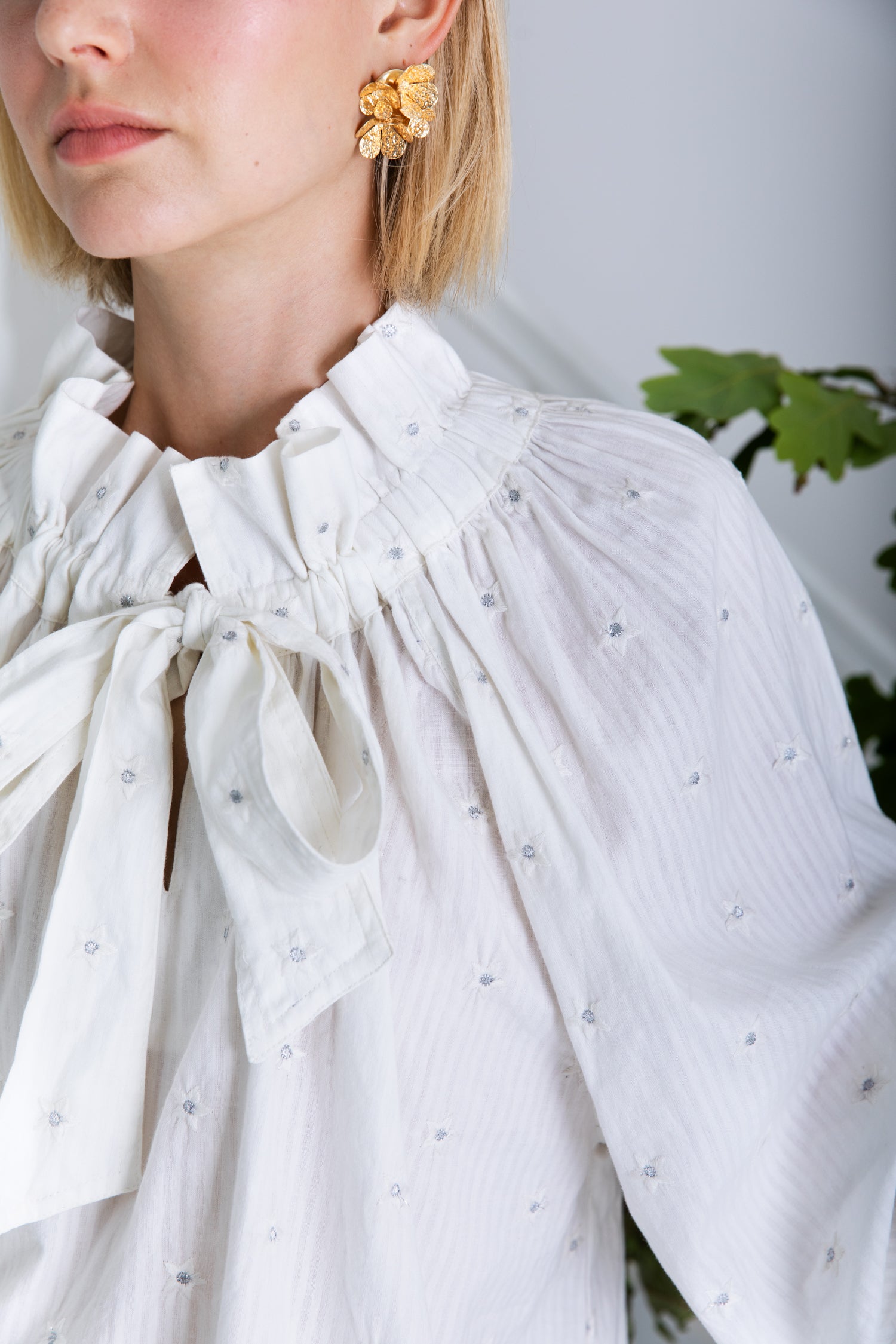 A romantic, elasticated gathered neck top, with a statement bow, in an organic self-stripe cotton, with an all-over embroidered.