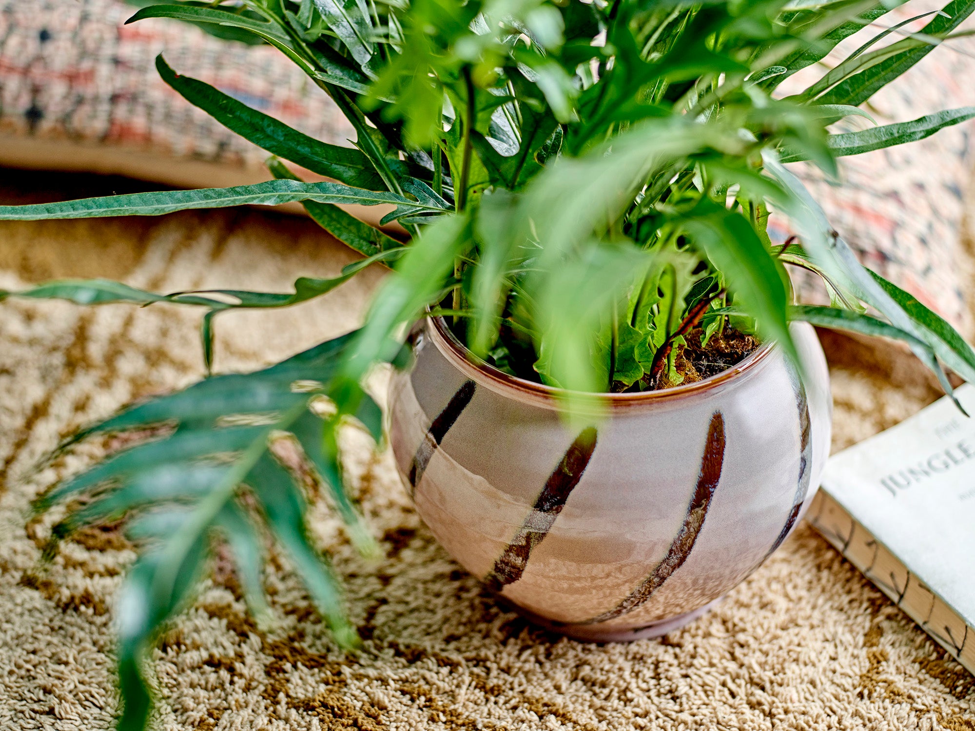 This beautiful pot is adorned with hand-painted dark stripes, creating a striking contrast.