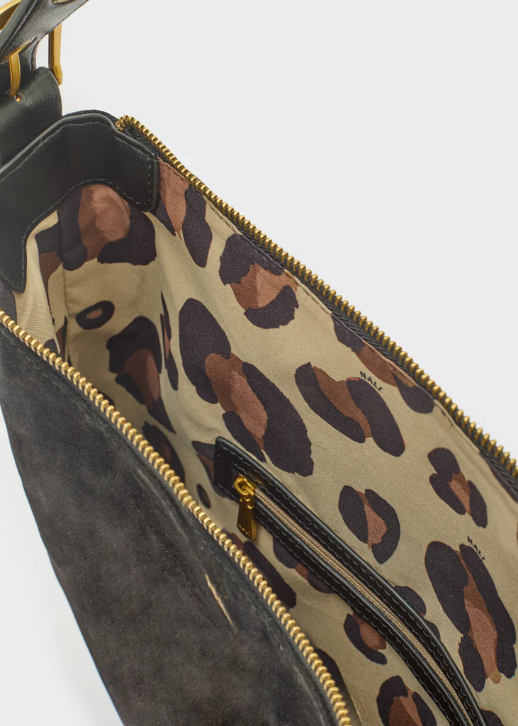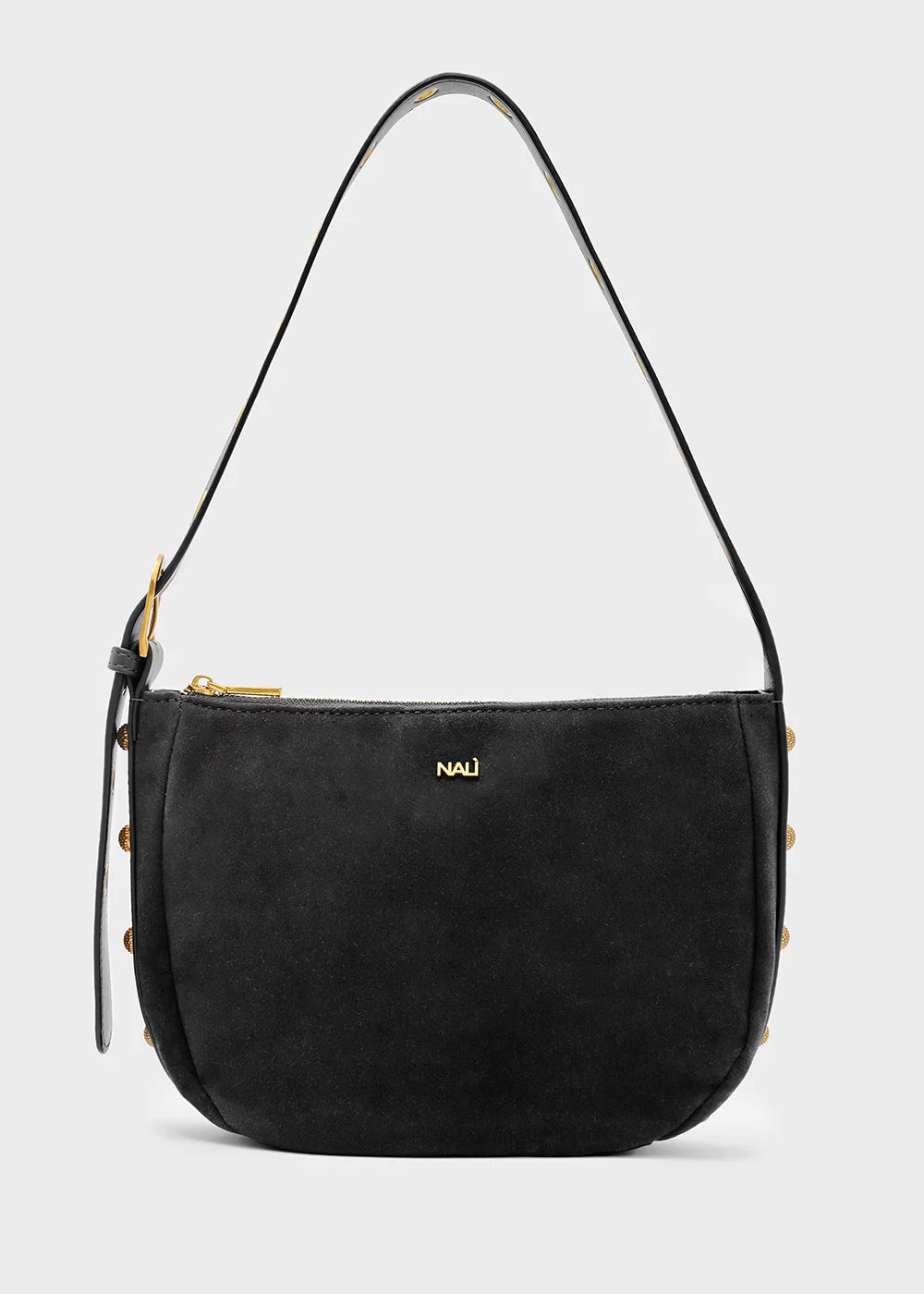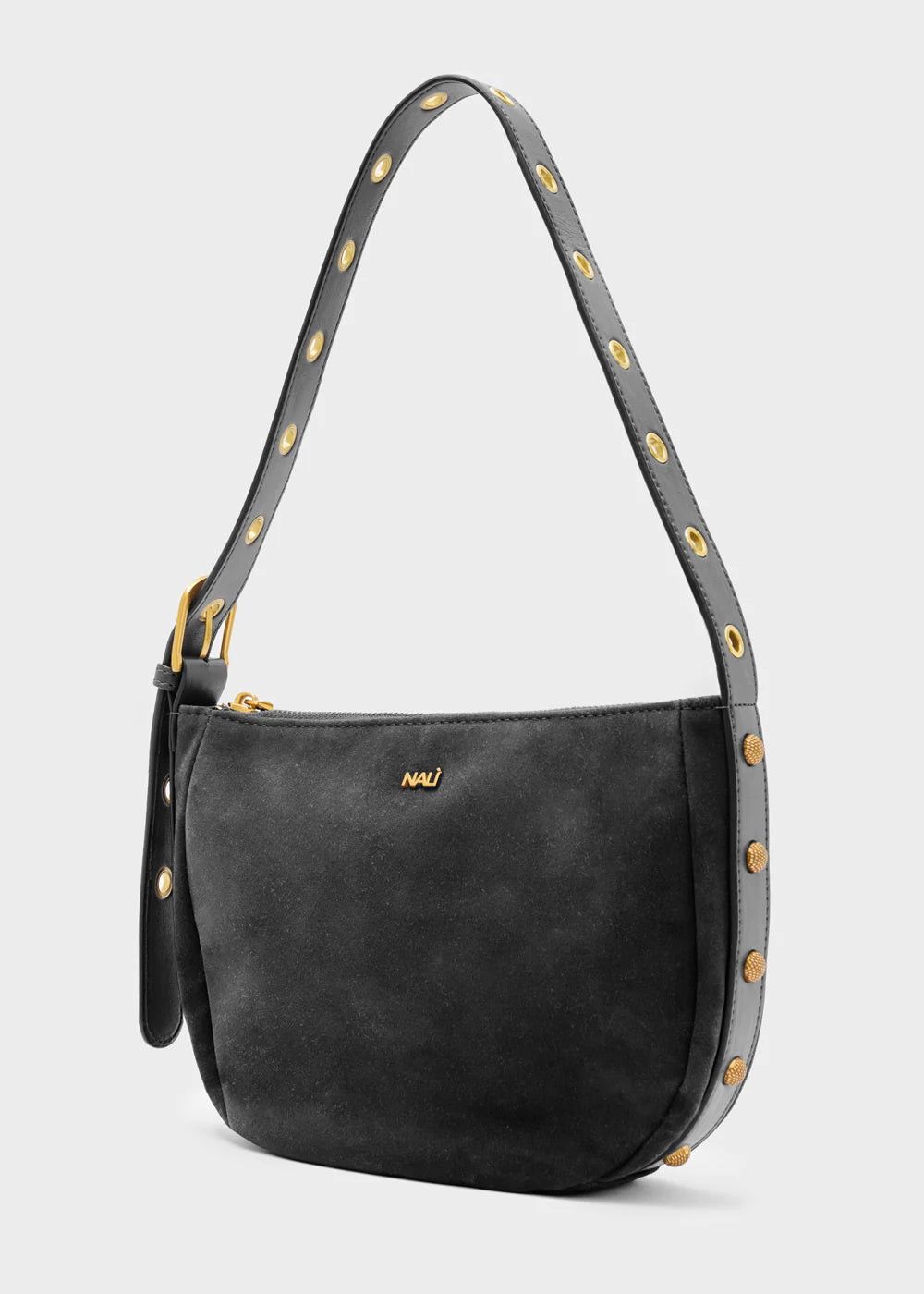 Compact faux suede handbag with a trapeze silhouette and knotted shoulder strap design. Lightweight and stylish, perfect for daily outfits or evening occasions.