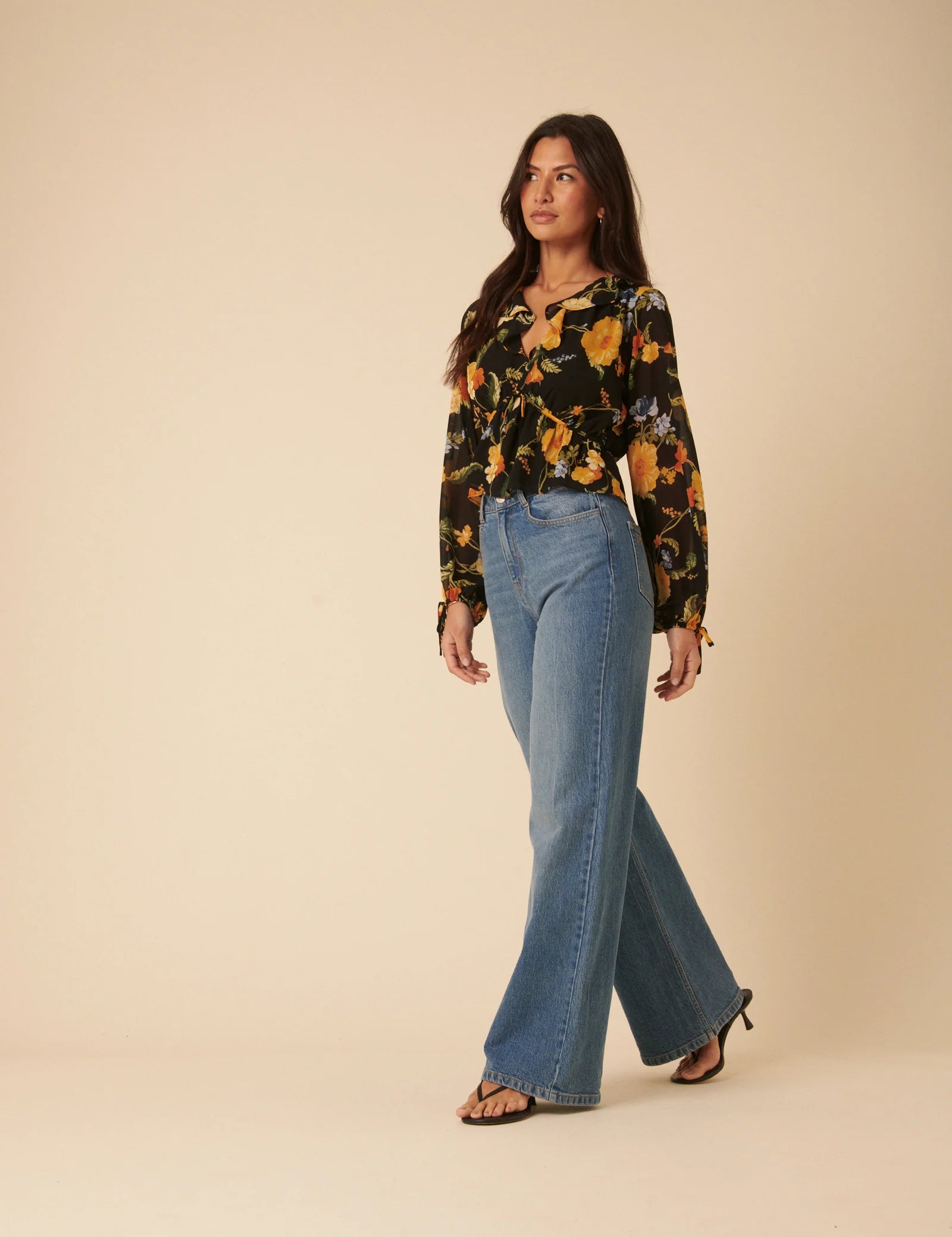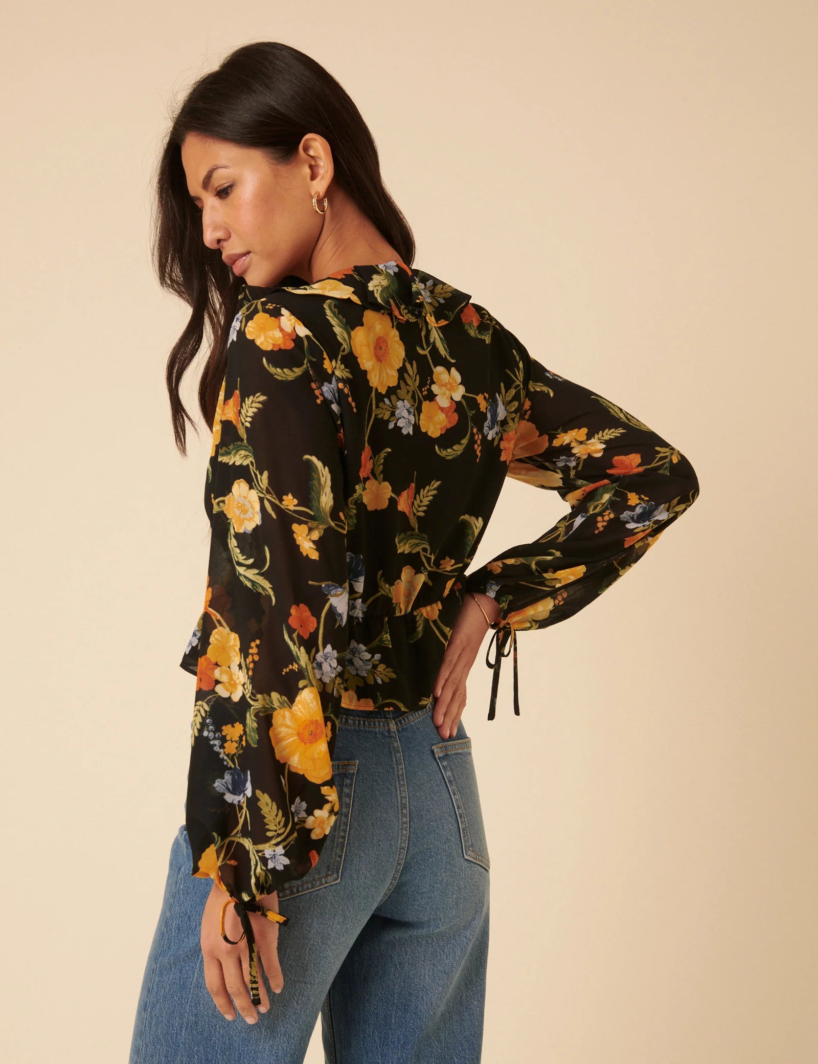 Black with vibrant tapestry florals, this floaty top features a ruffled collar and pretty tie details.