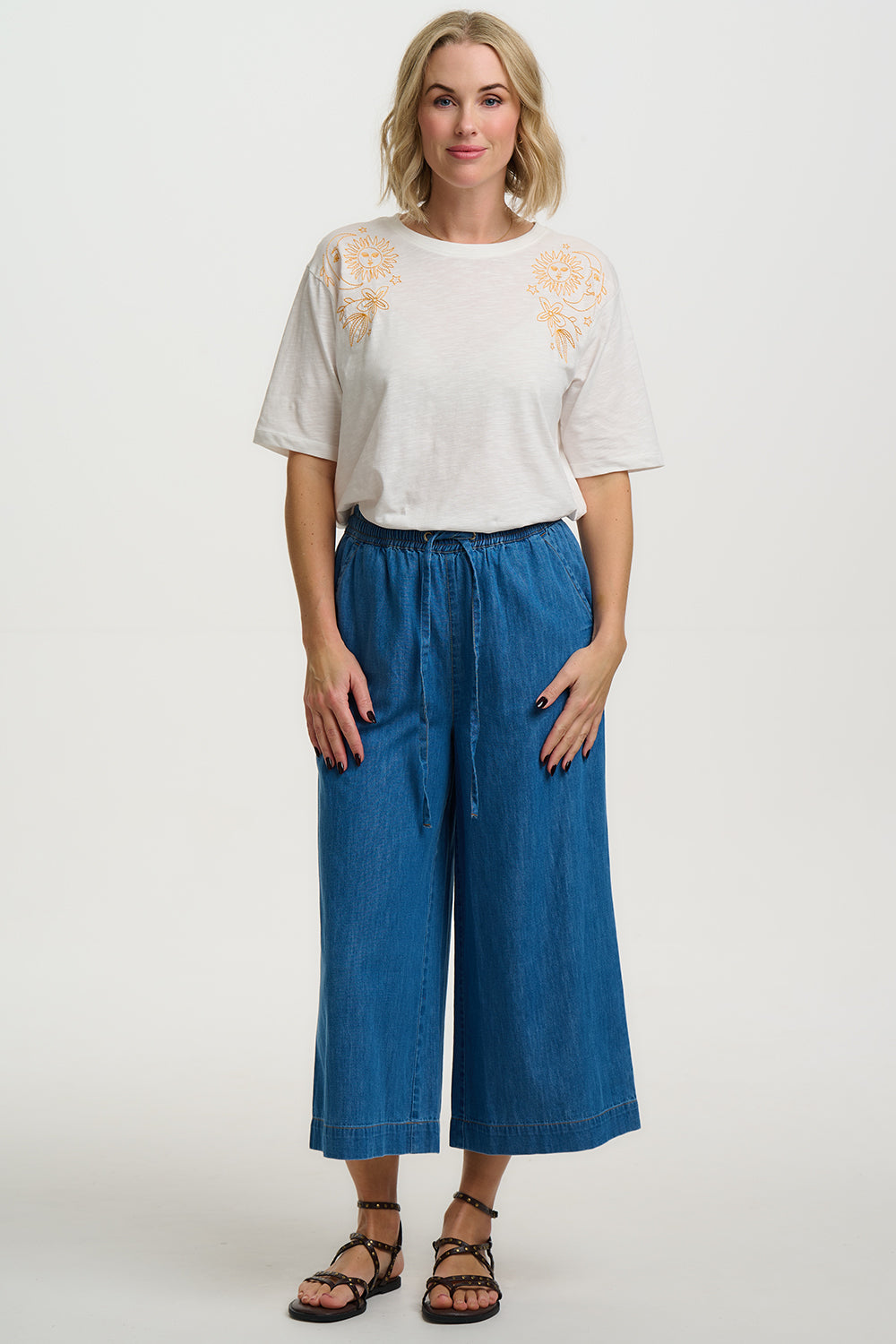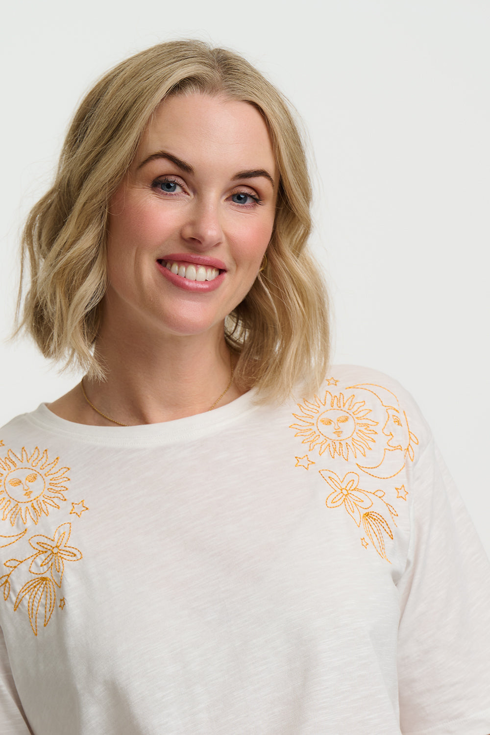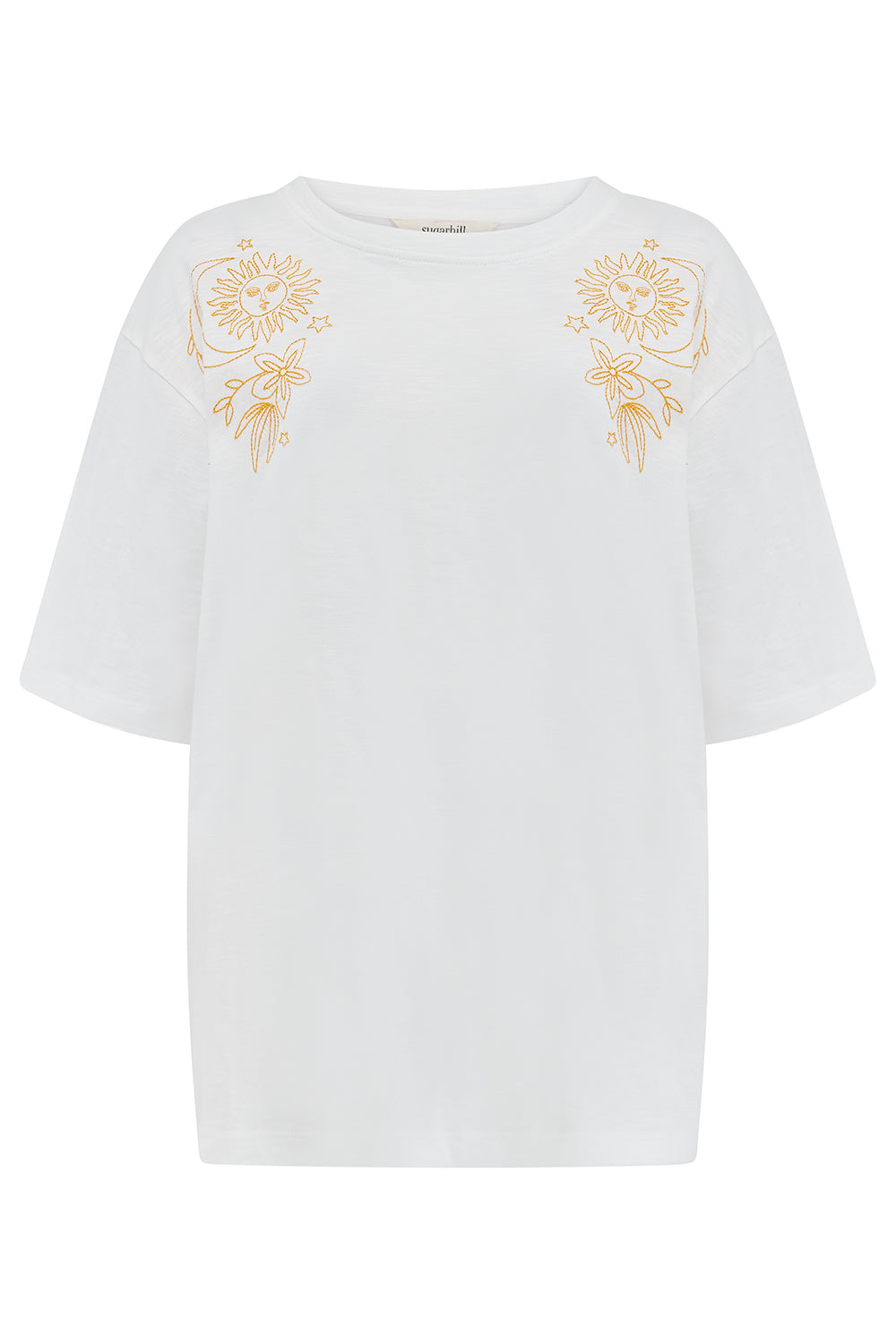 Oversized soft cotton tee with gorgeous sun, moon and flowers embroidery design.
