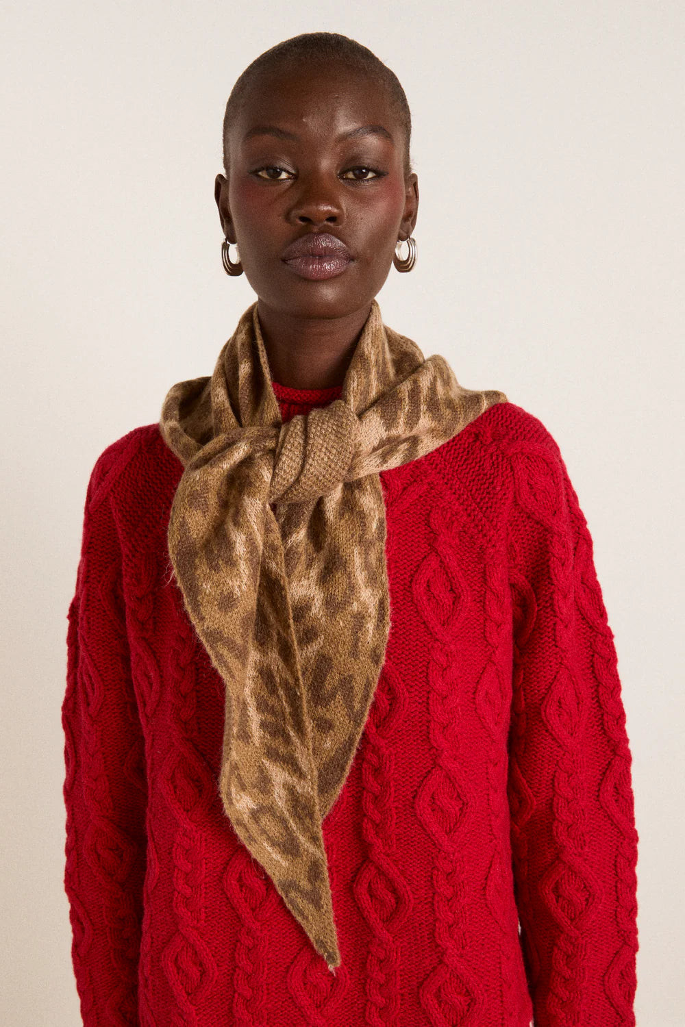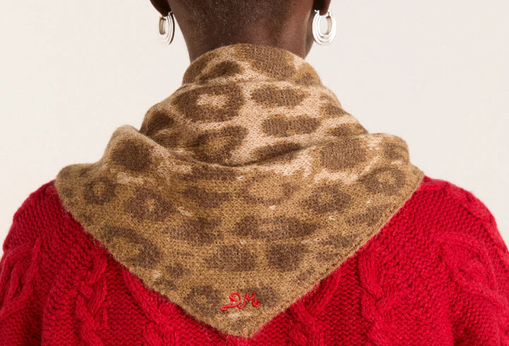 This knit headscarf features the signature DM leopard design, finished with contrast red DM embroidery for a bold touch.