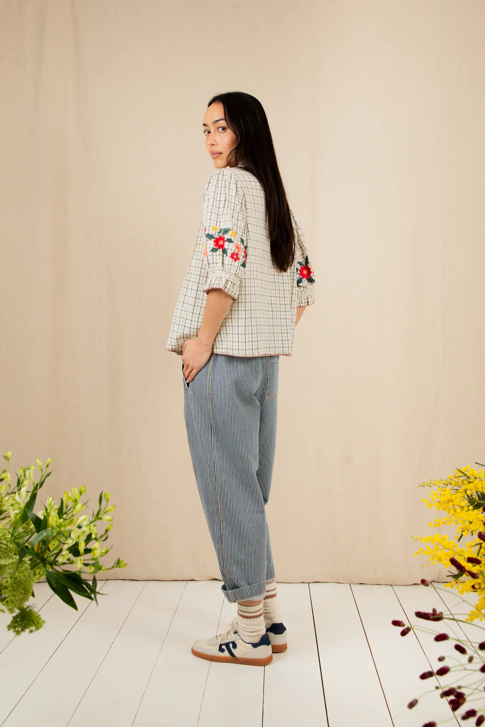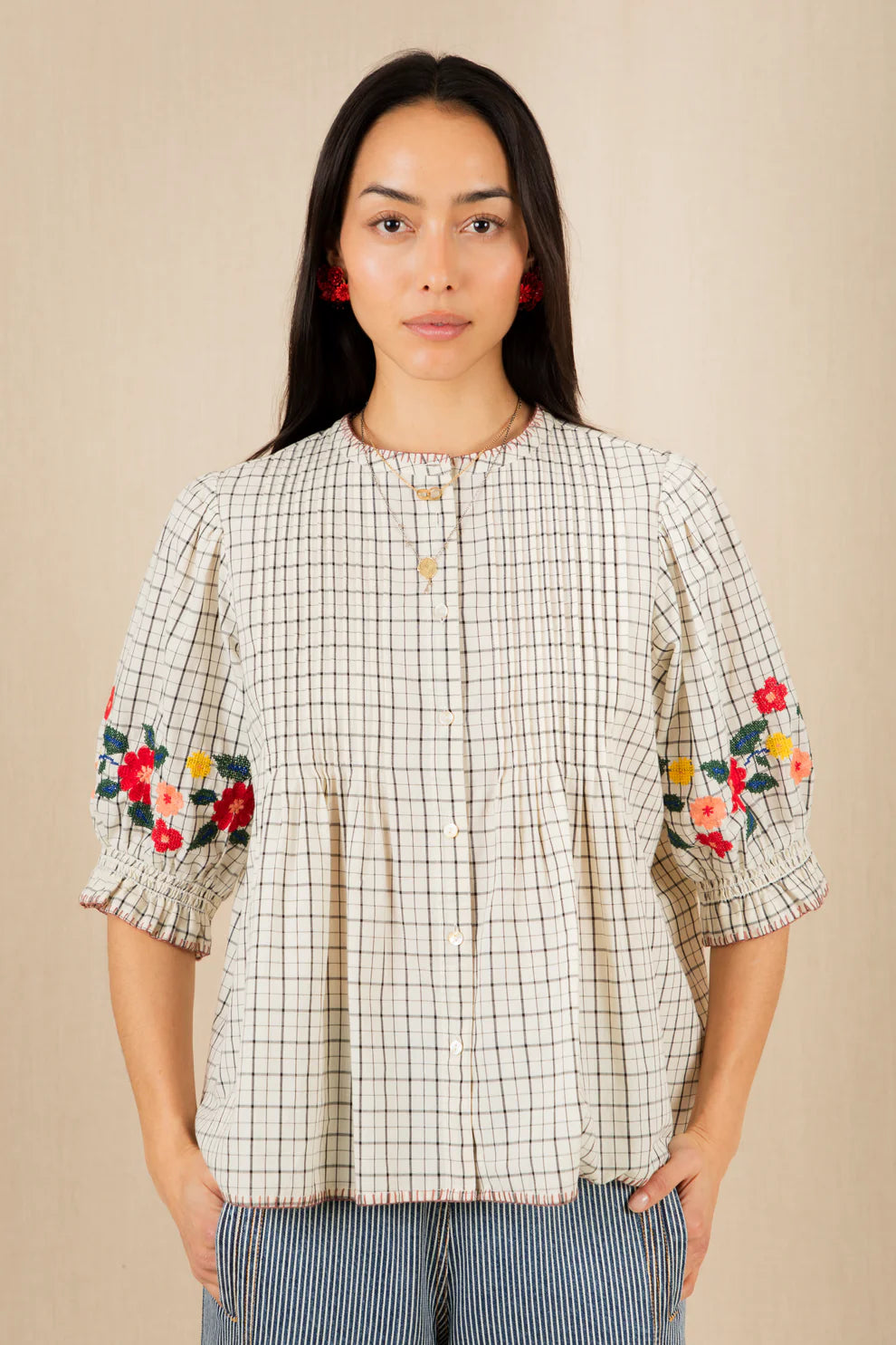 The elbow length sleeves have a placement embroidery, with a smock elasticated cuff.