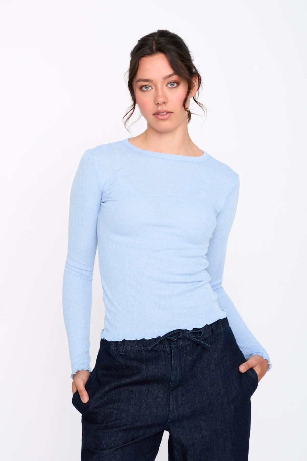 Long-sleeved top in a icy pale blue with ruffled hems.