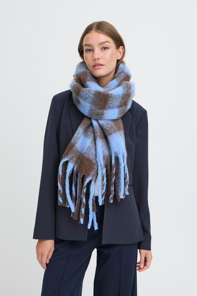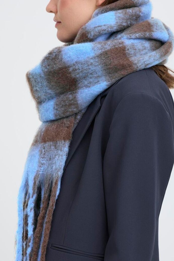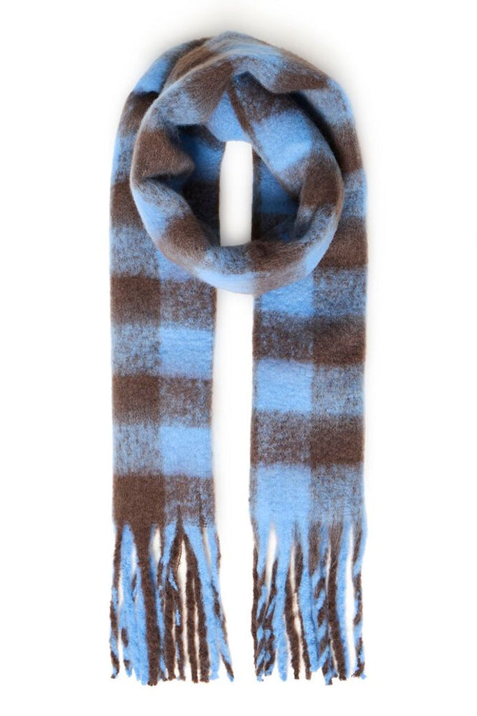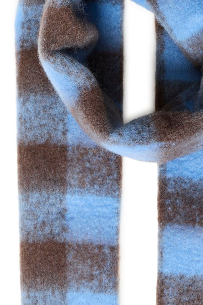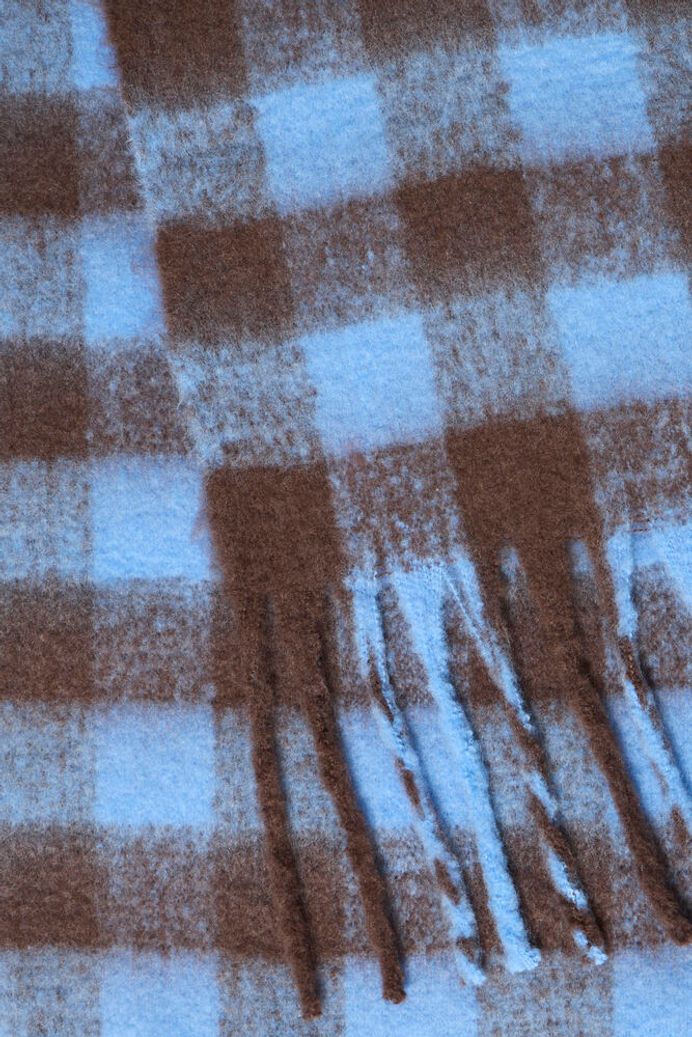 A lovely and soft light blue and coffee bean brown check scarf.