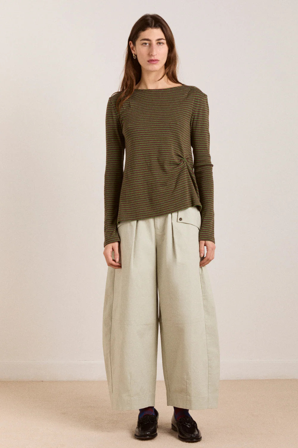 The Mara Trouser delivers a modern utility feel with its barrel-leg shape and mid-rise fit.