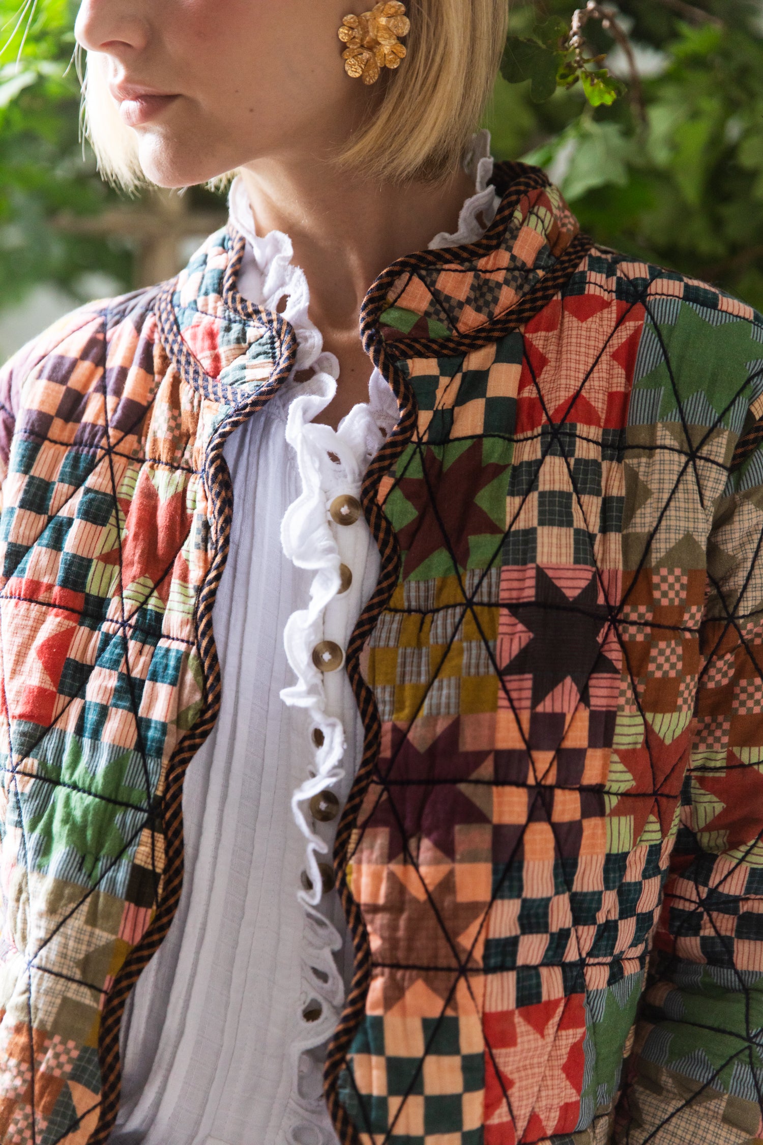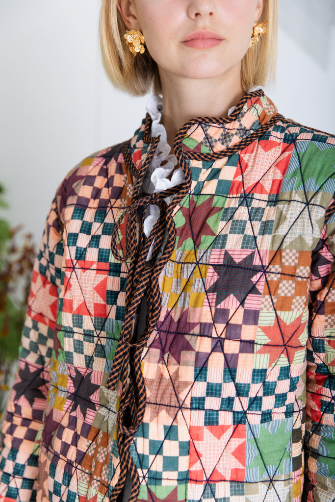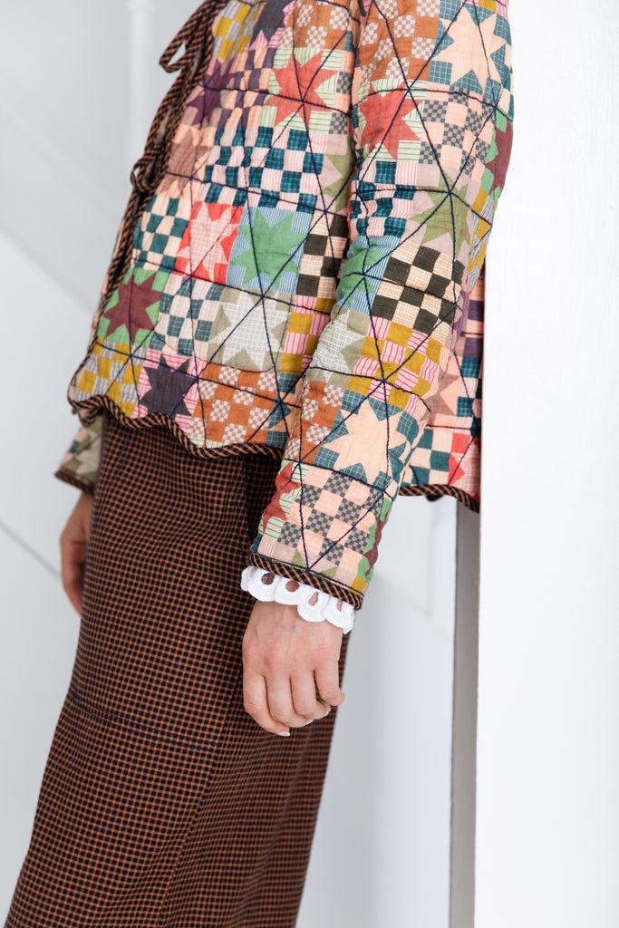 Dyed check on one side and a signature organic cotton patchwork print on the inside. All the edges of the jacket are scalloped and bound with a contrast micro gingham.