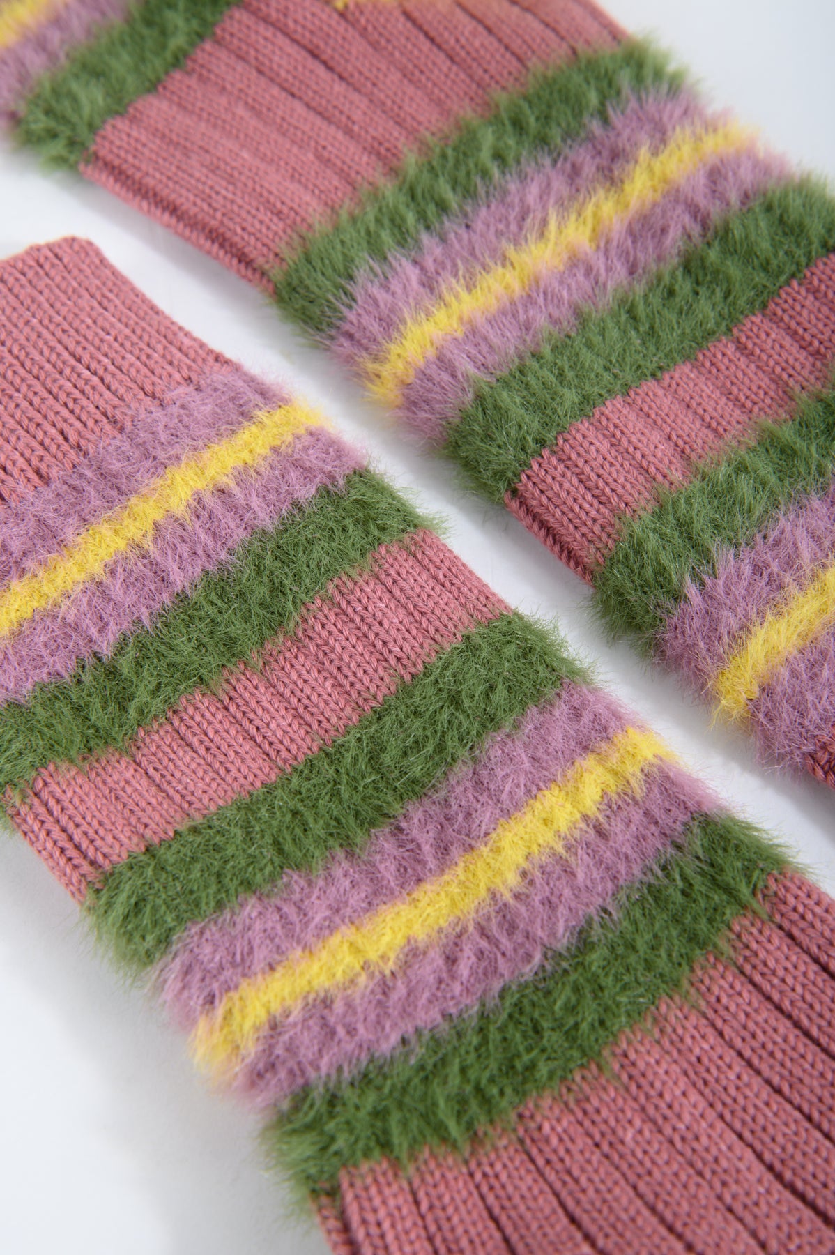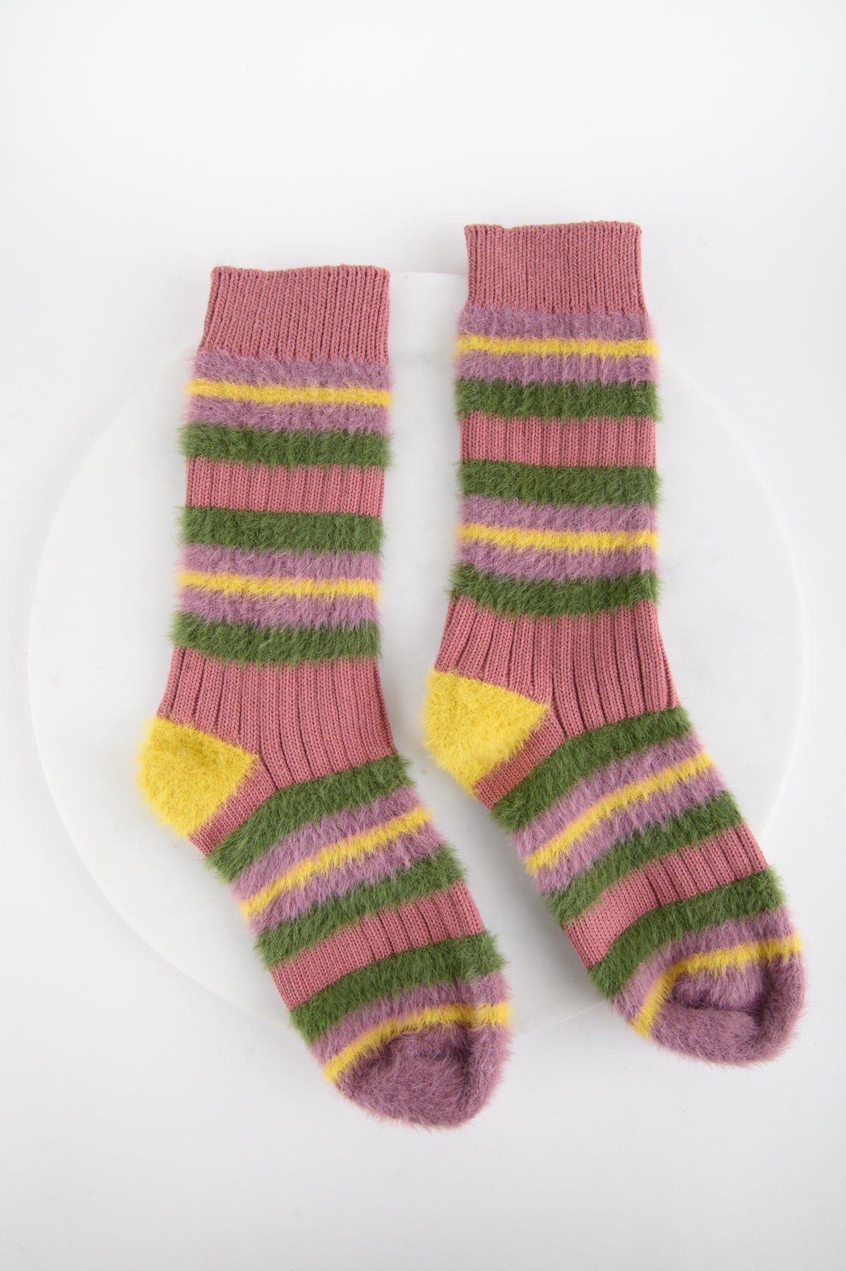 The cutest fuzzy striped socks in pink, yellow, lilac and green.