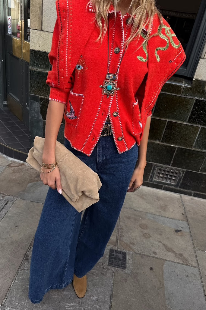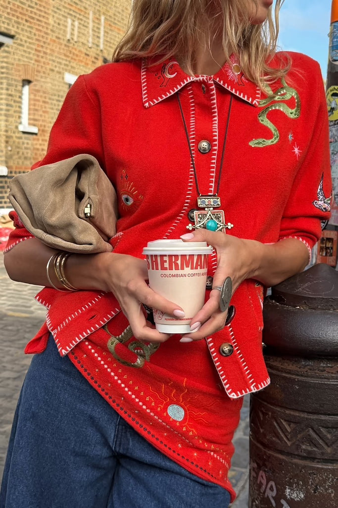 Stunning red cardigan in a structured silhouette, ideal for the season, a light throw over for when it gets chilly in the evenings, with the fit of a jacket.