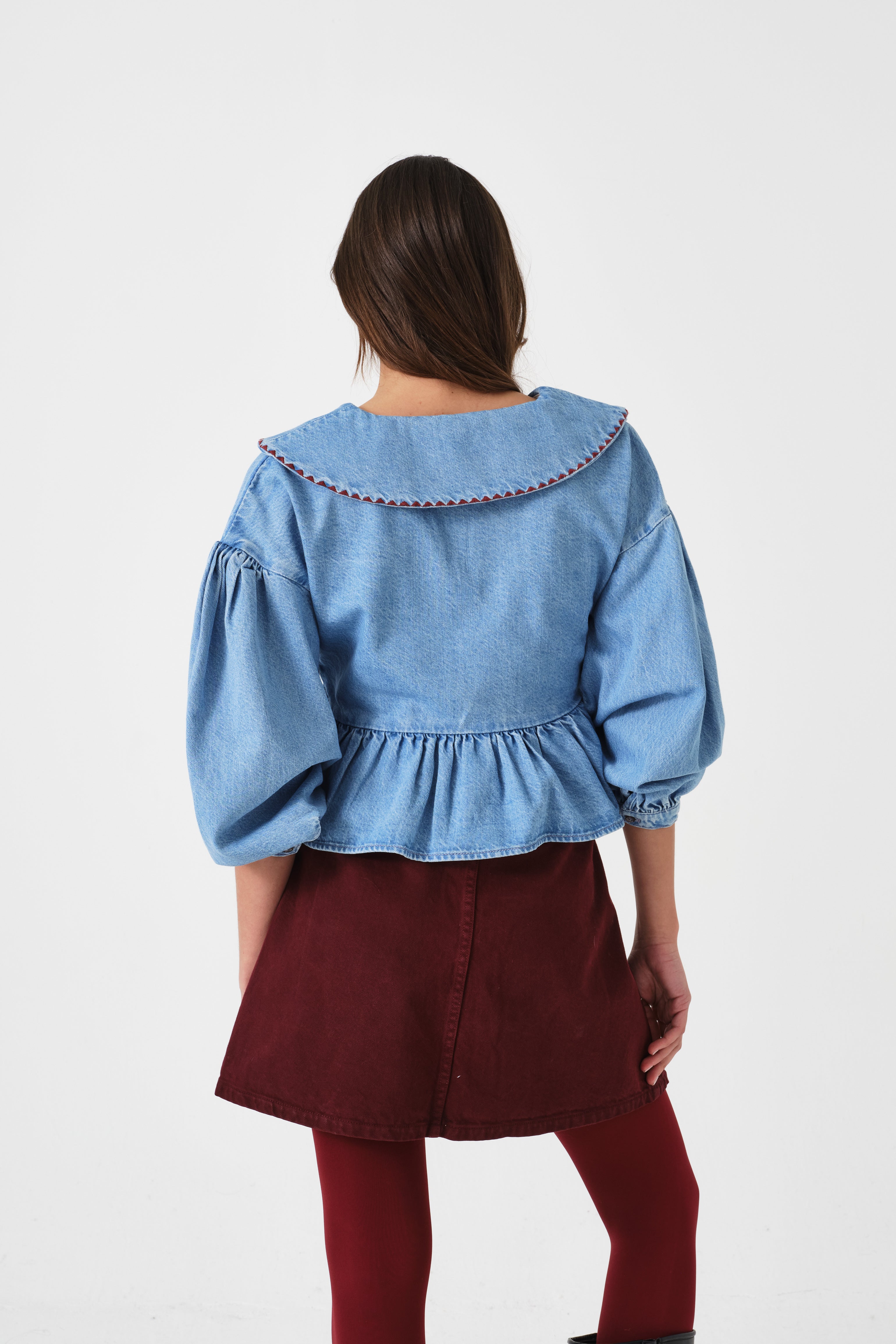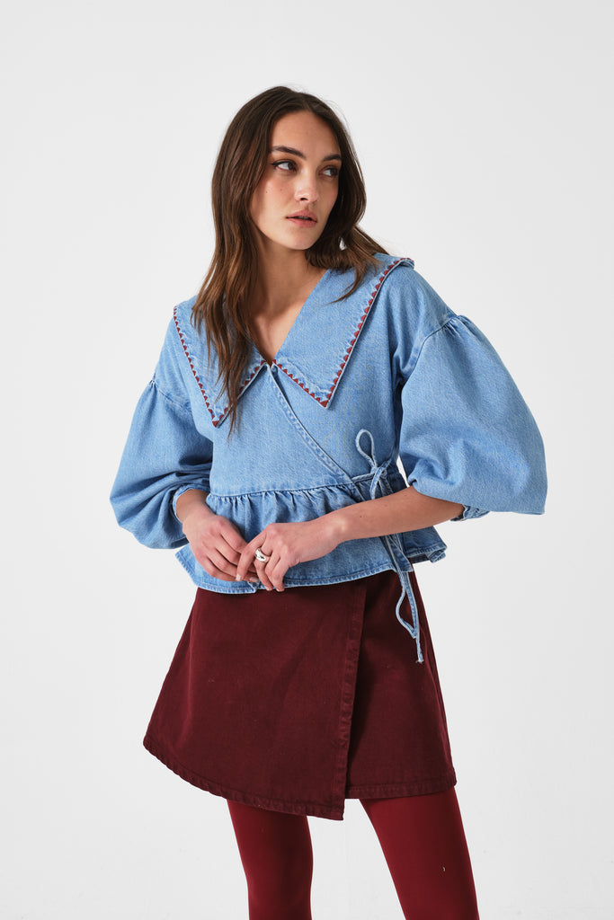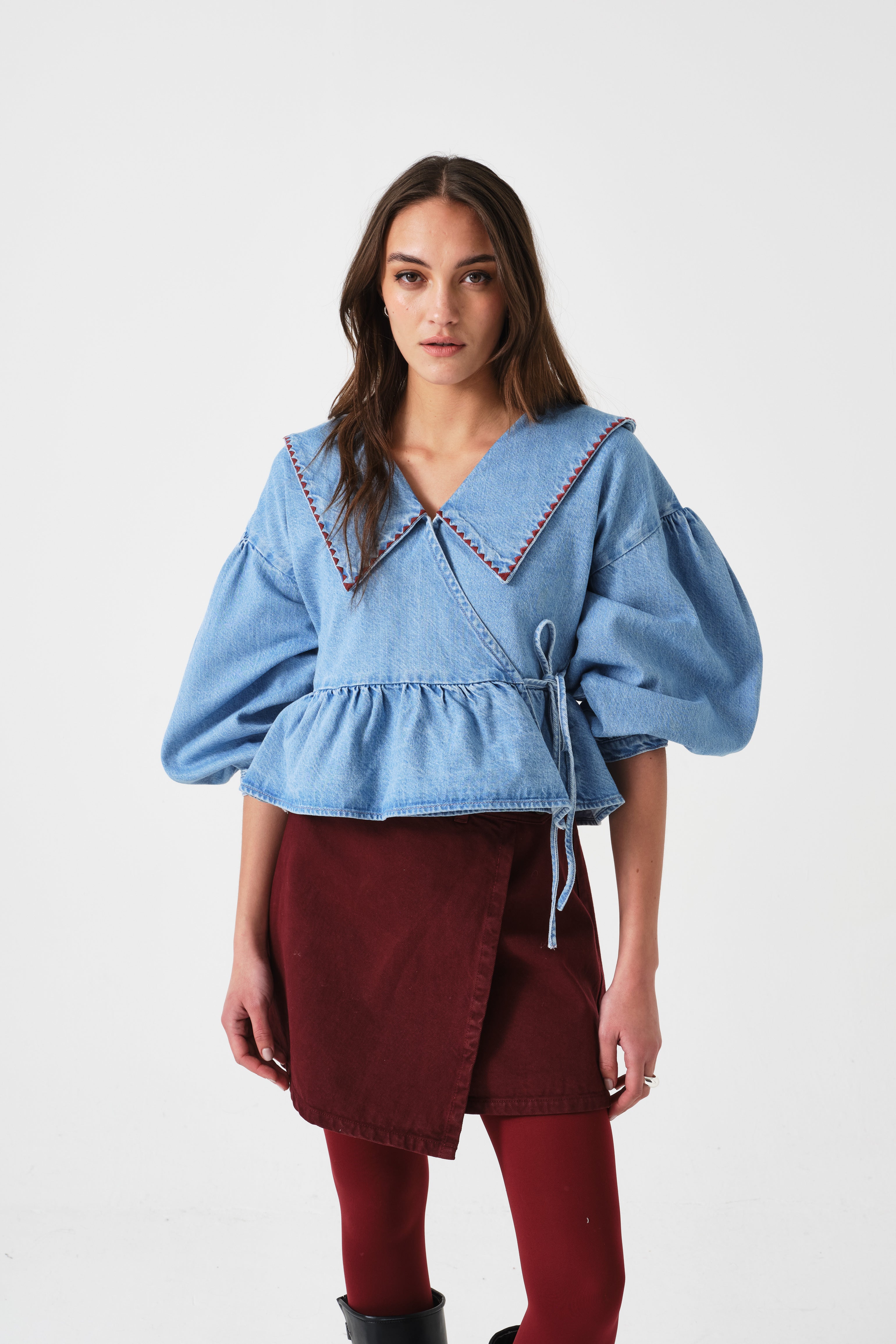 A beautiful statement denim wrap top in a light sky blue denim colour.