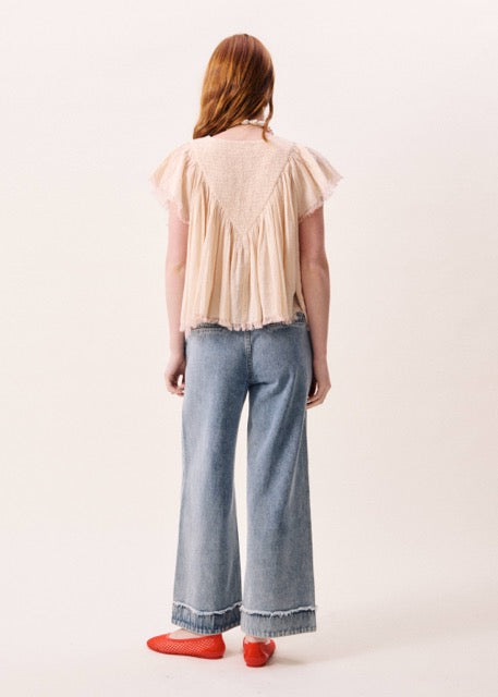 Beautiful shirred detailing around the v-neck collar and continued onto the back in a deep v shape, frayed edges at the waist and sleeves.
