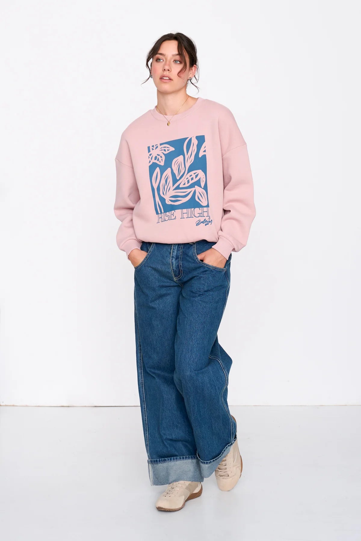 Pink printed sweatshirt with contrasting teal blue print with a botanical theme.