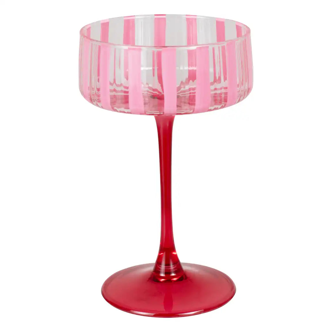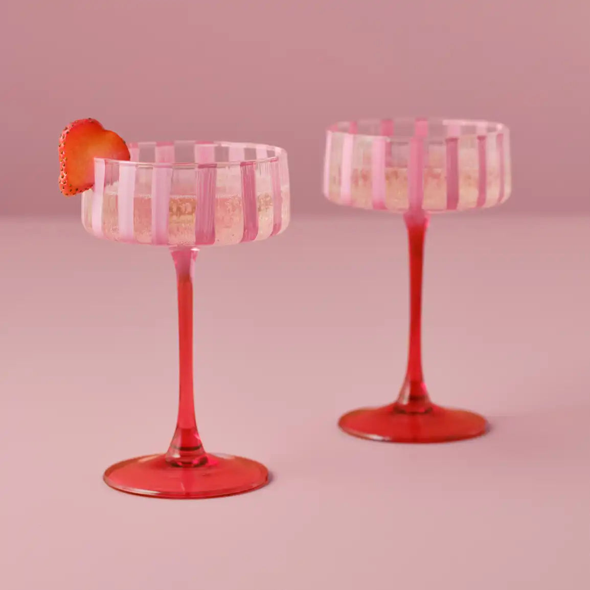 Add a fun touch to your dinner with these pink striped glass coupes with a lovely red stem.