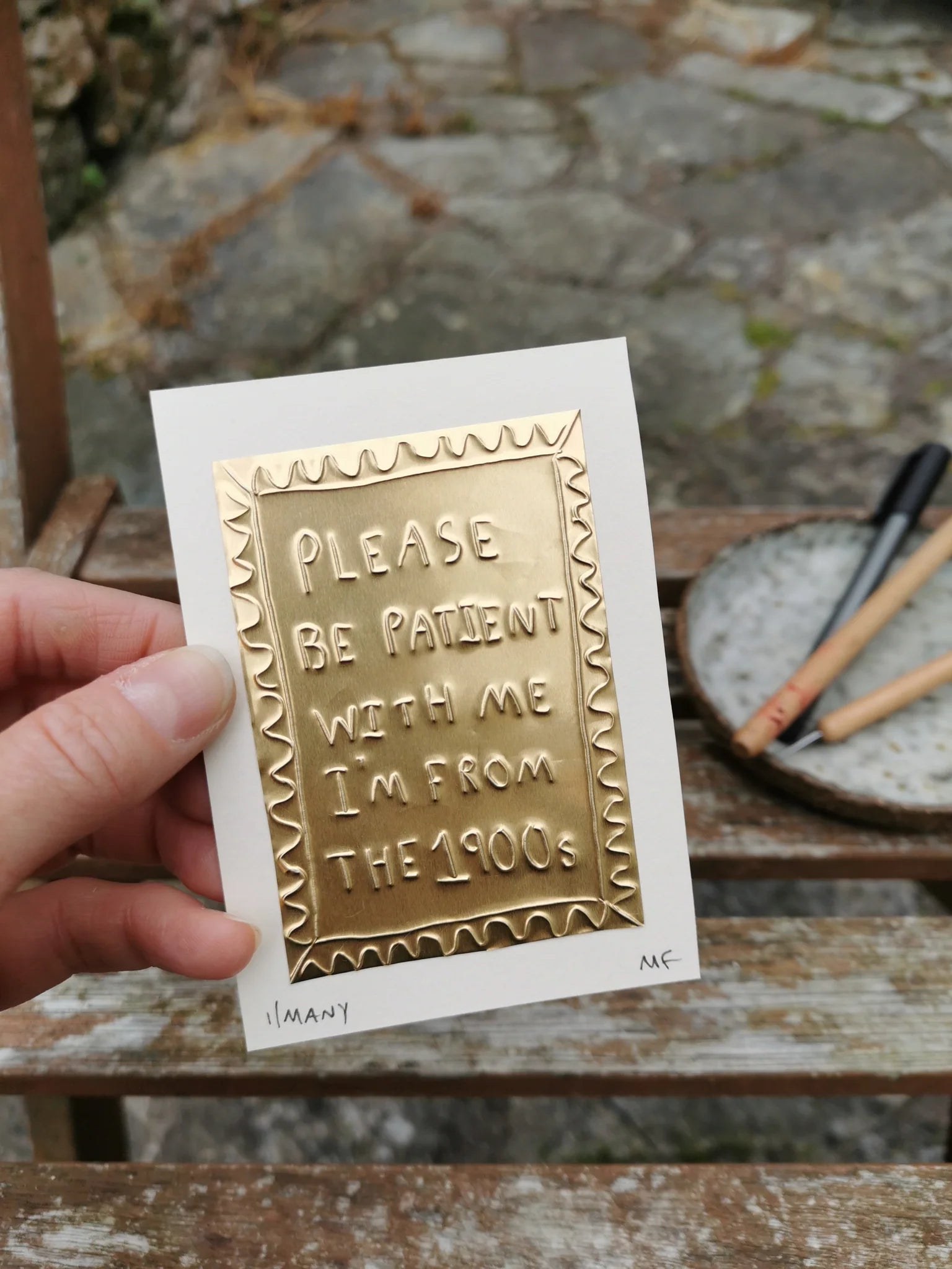 A hand embossed artwork featuring the text 'Please Be Patient With Me I Am From The 1900s' on gold coloured tin, mounted on a white cardstock.