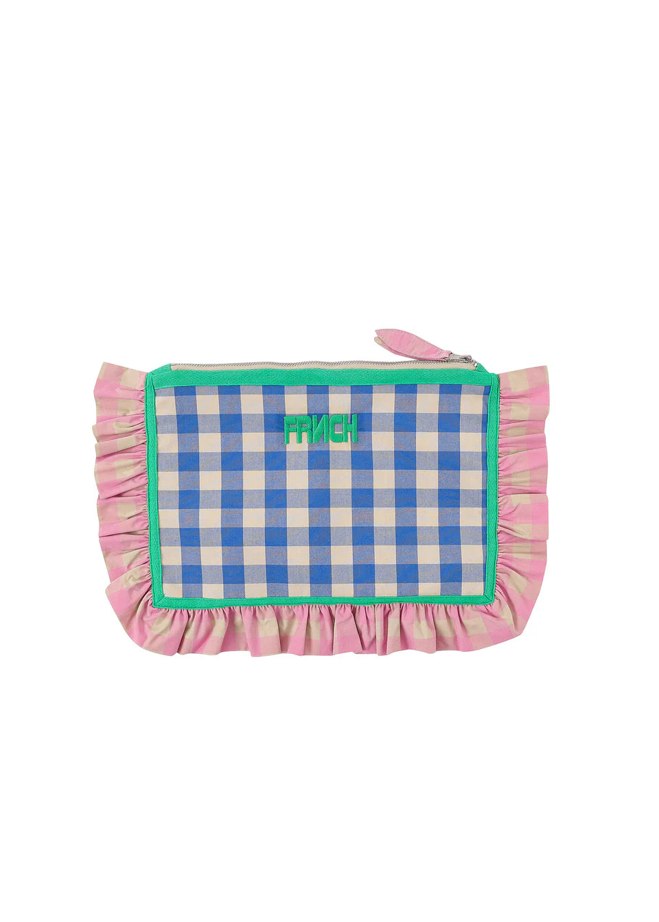 Checkered fabric pouch with gathered ruffles and zip closure.
