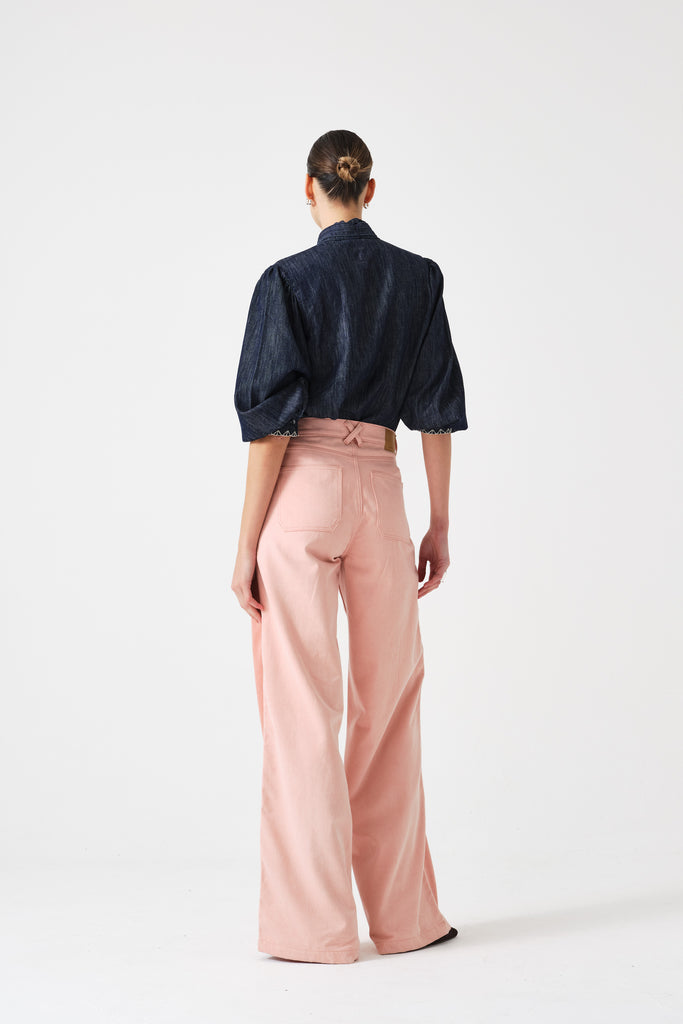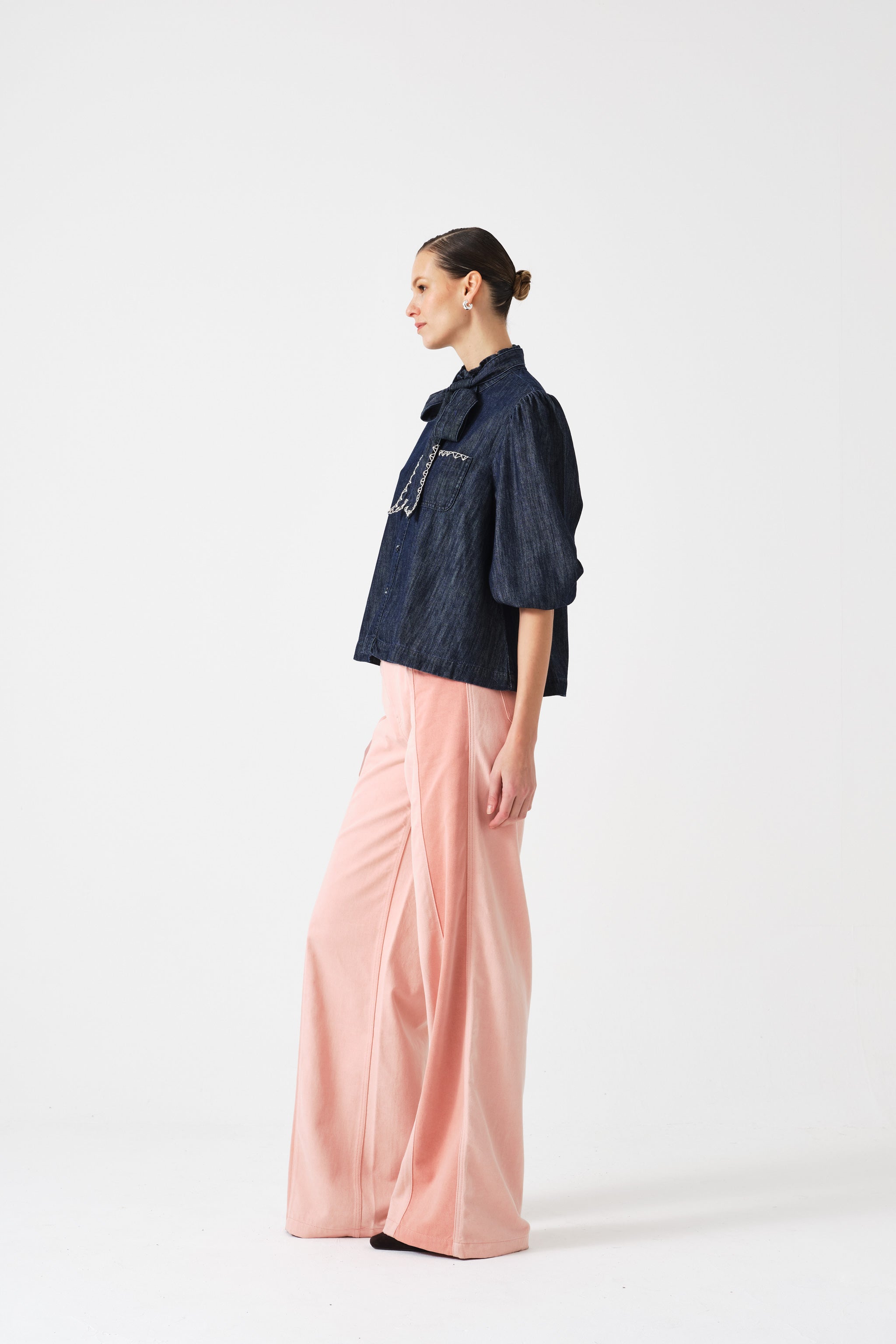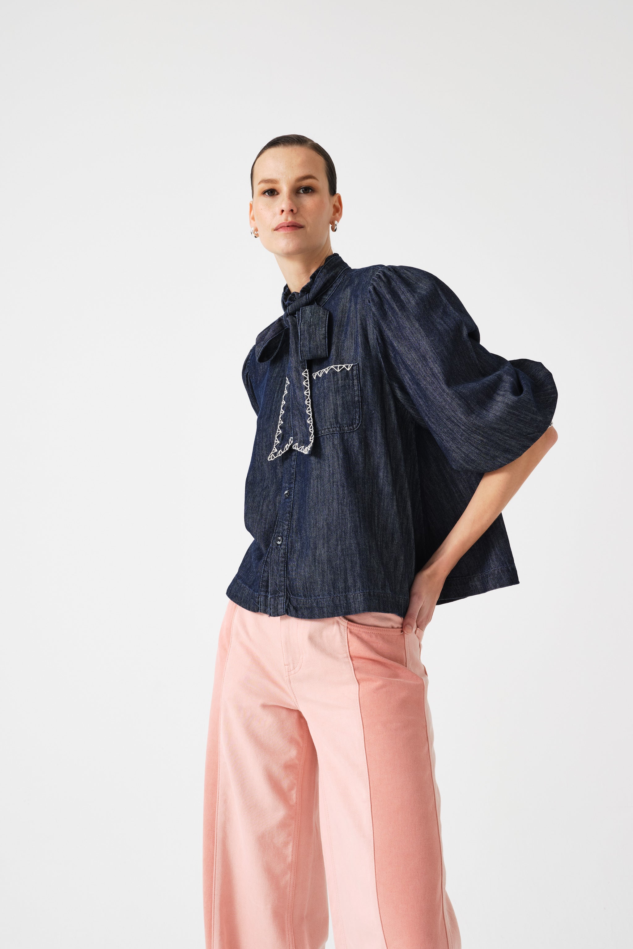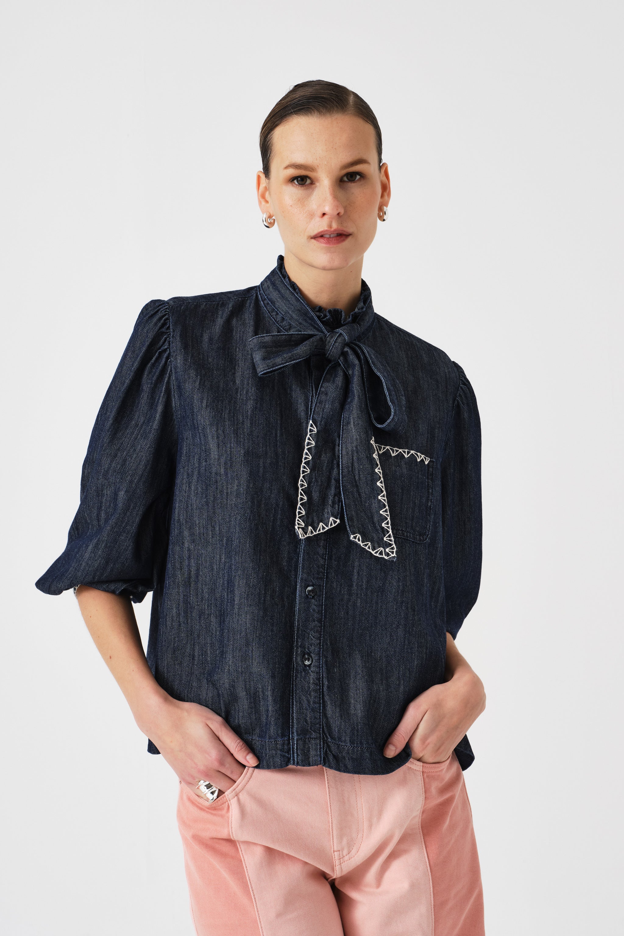 A sweet cropped bow blouse designed to carry you from morning work to evening dinners with ease in a rich deep denim blue.