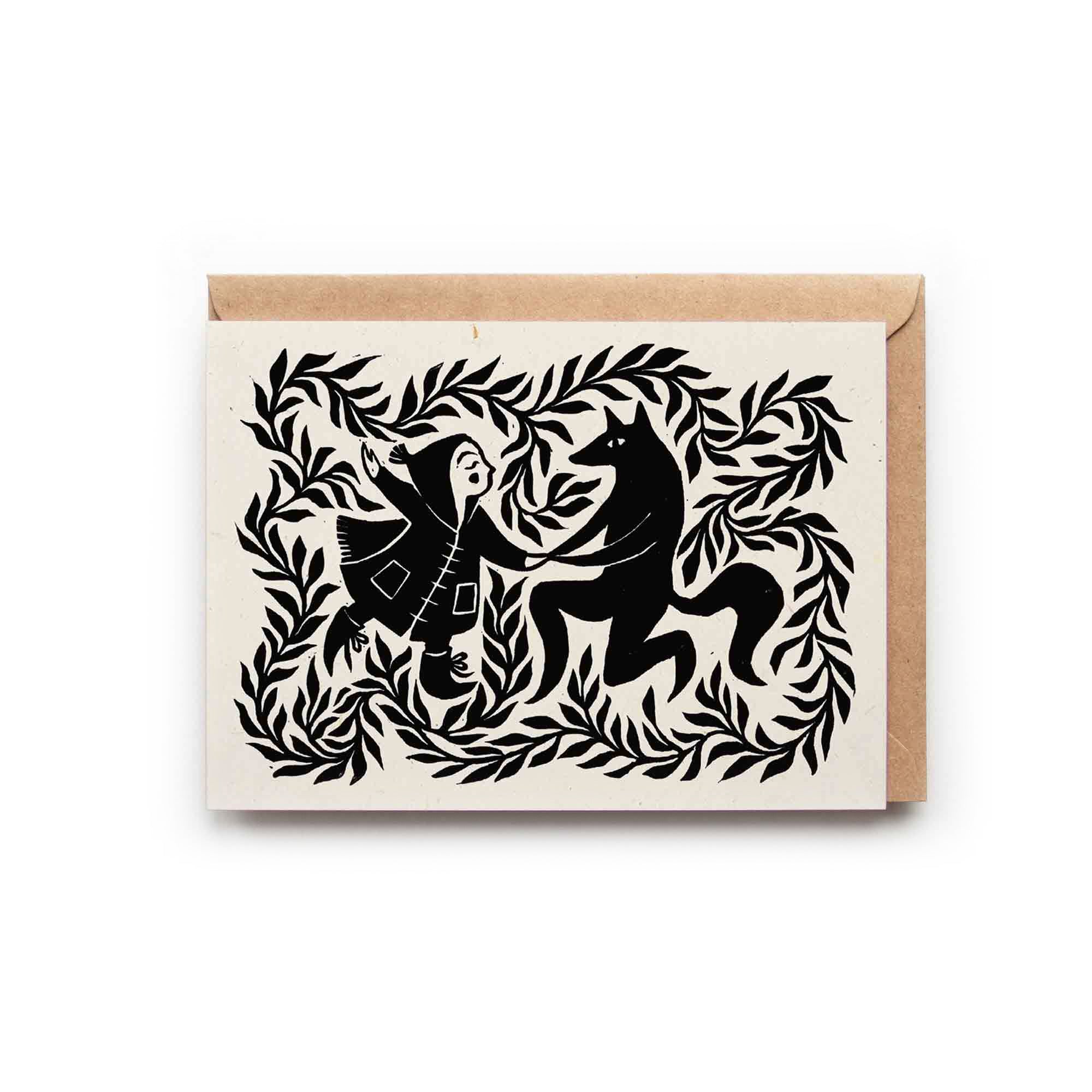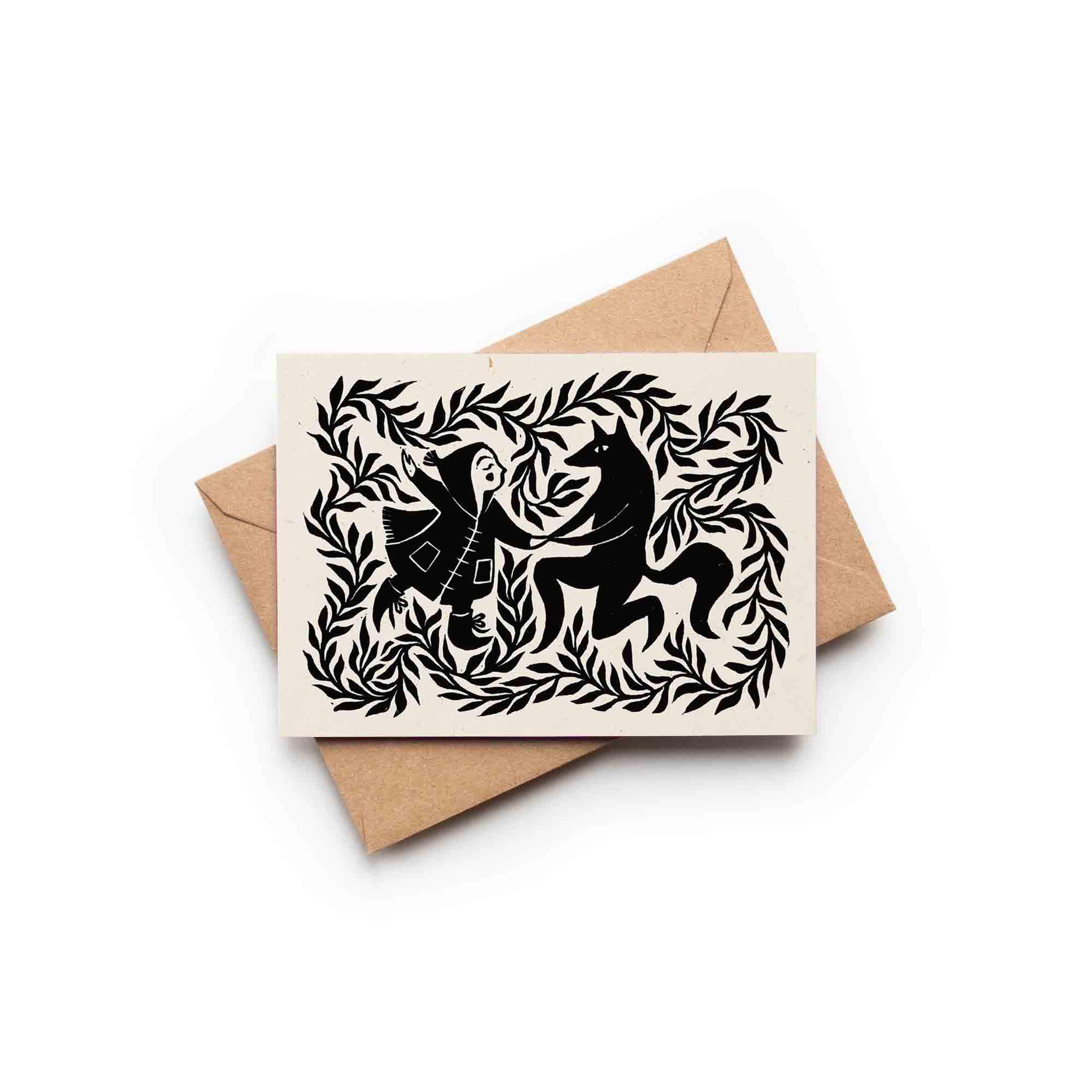 This is a fine art greeting card featuring the lino print 'Red Riding Hood with Friendly Wolf', 2024.