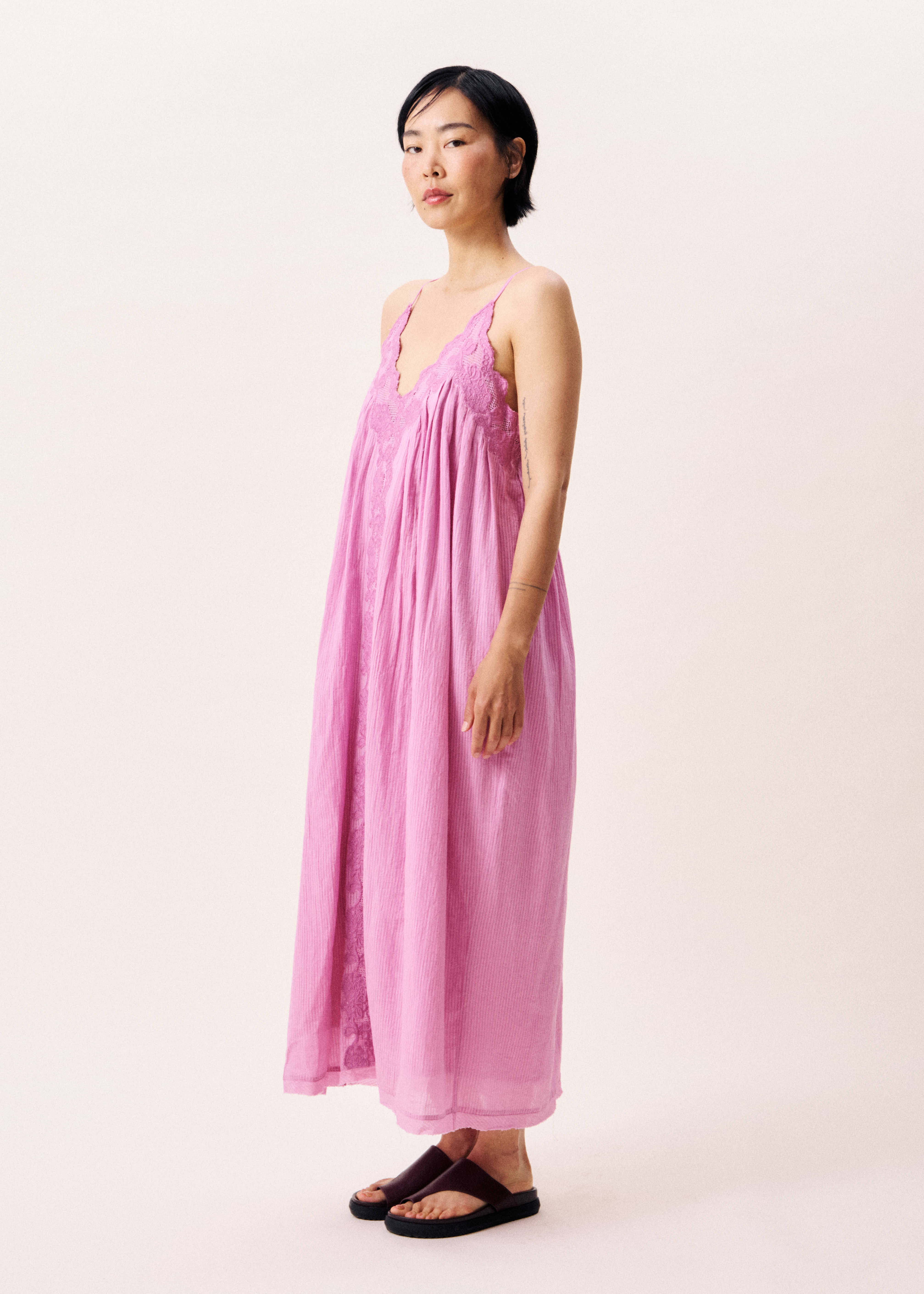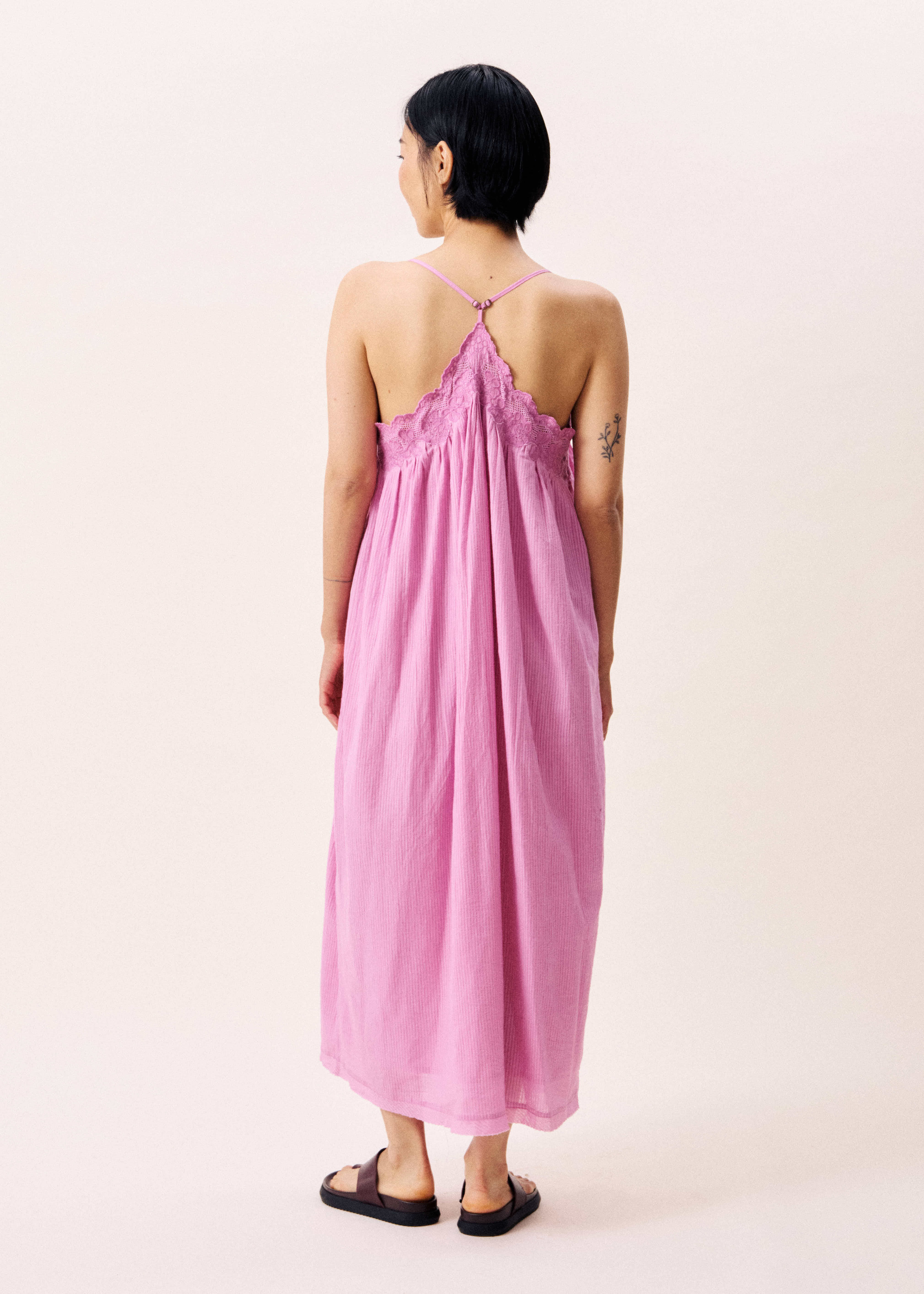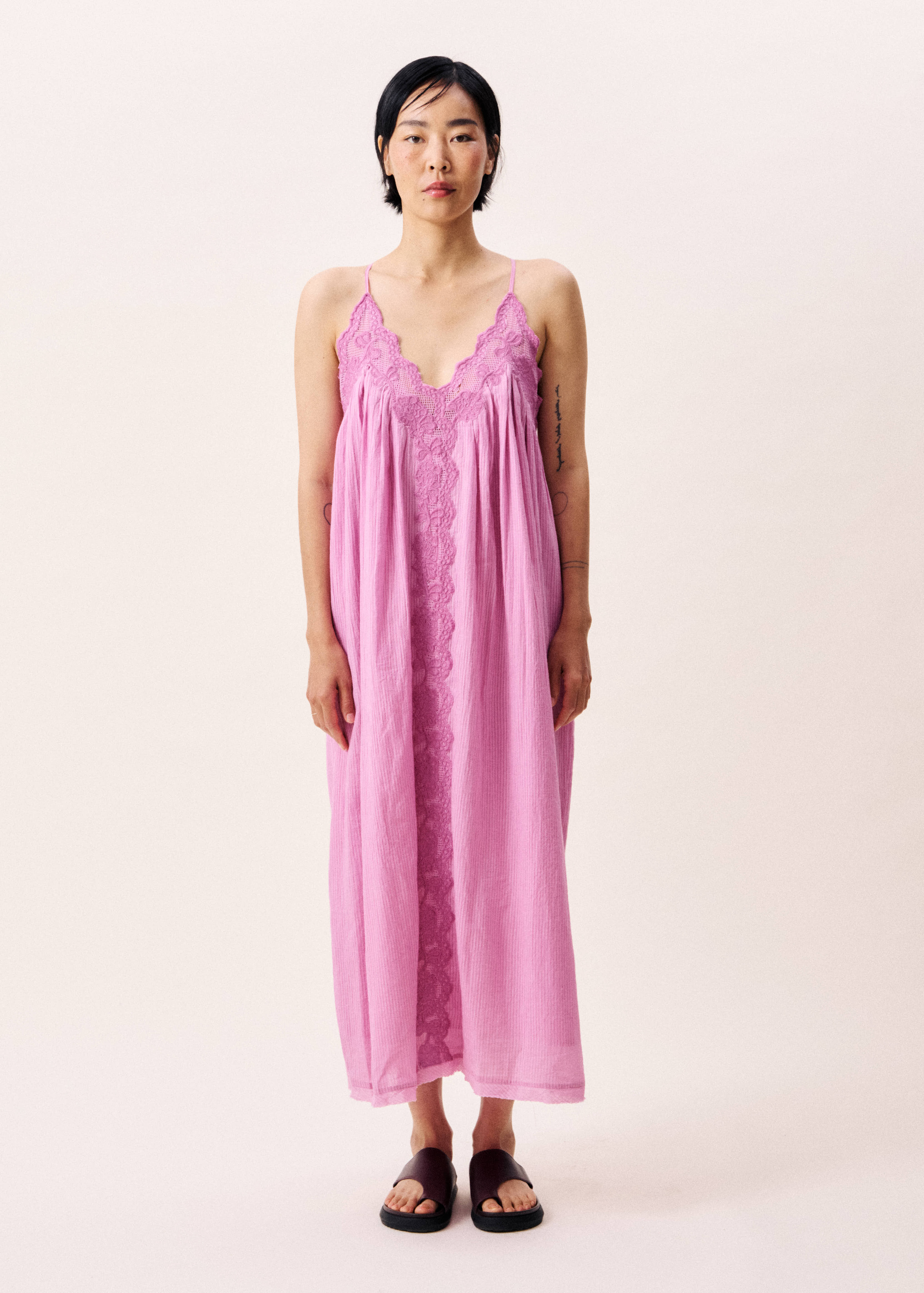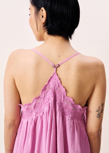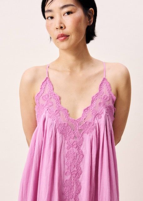 A vibrant violet coloured dress with beautiful lace details and adjustable thin straps.