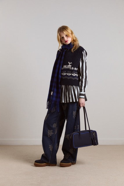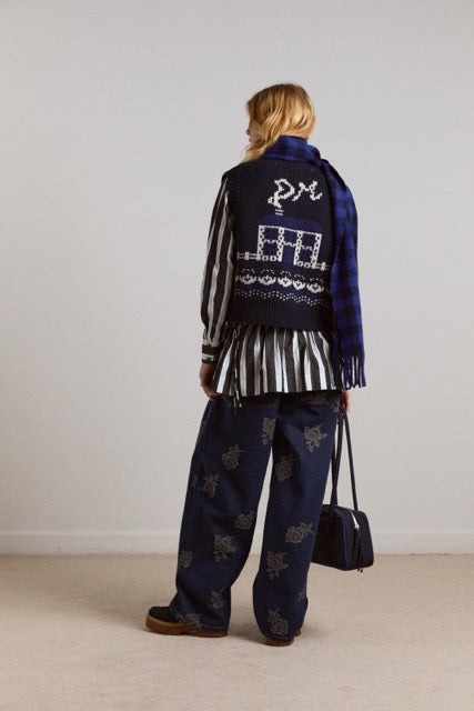 A modern staple with thoughtful detail, the Rhona Lambswool tank is a boxy-fit knit featuring a sharp V neckline and a minimalist front, whilst the DM house motif on the back adds a quiet touch of character.
