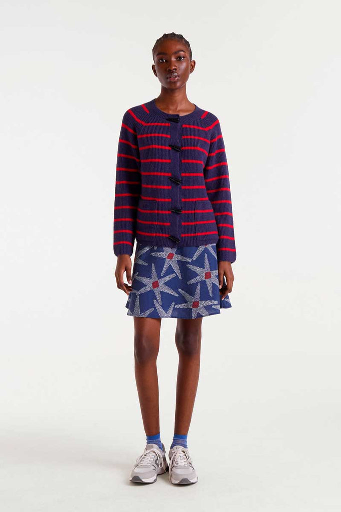 Cosy navy and red striped cardigan with lovely statement toggles down the front.