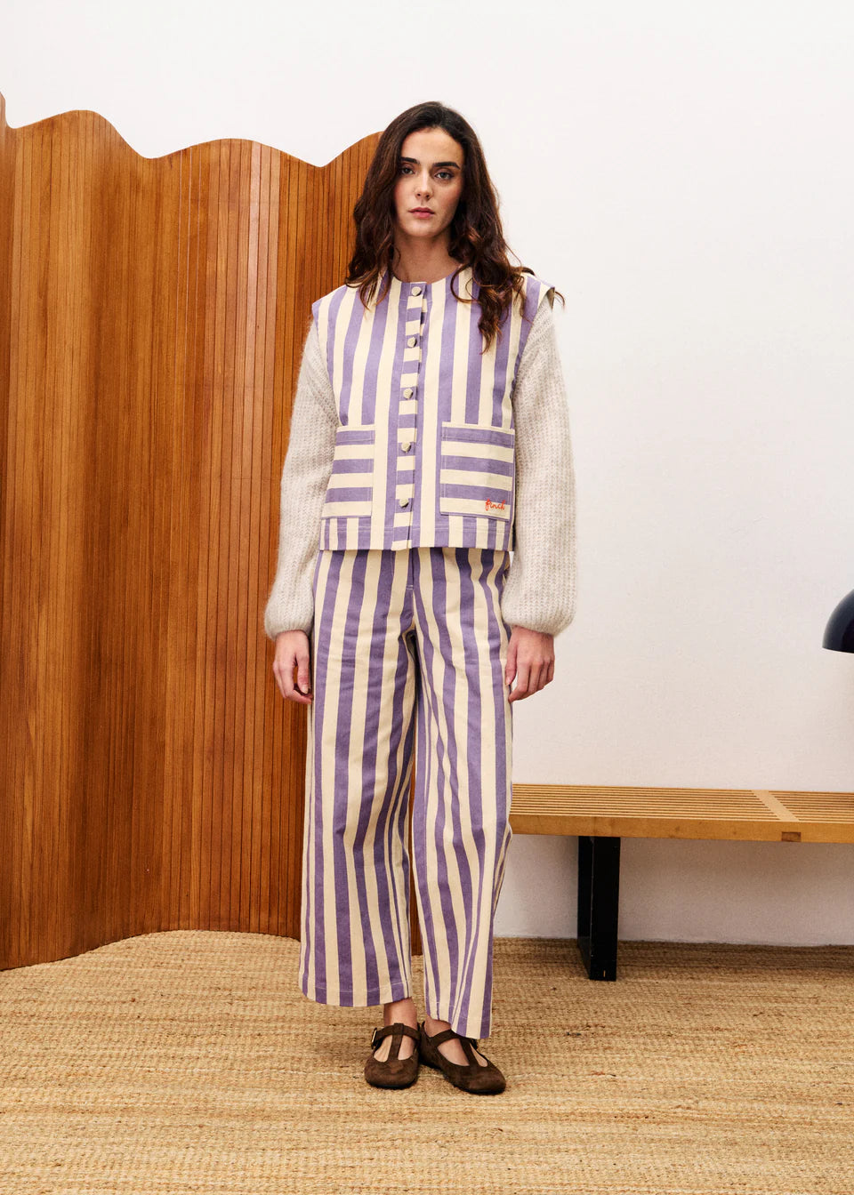Be the coolest person around in this lilac striped sleeveless vest that just exudes fun and lots of character.