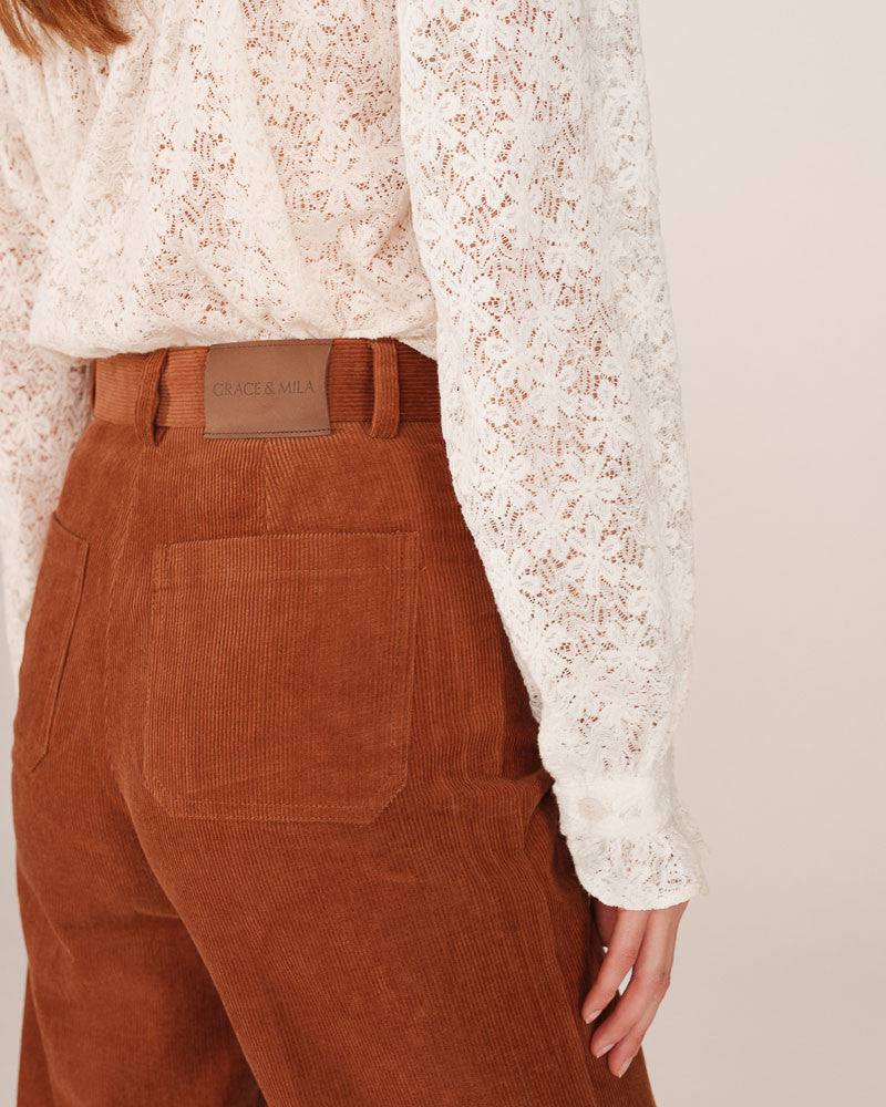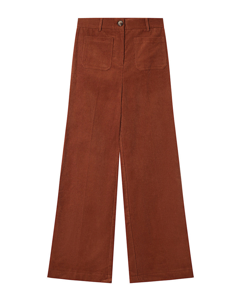 Crafted from corduroy fabric in a warm red brick colour, the Samba wide-leg trousers offer a 70s-inspired silhouette.