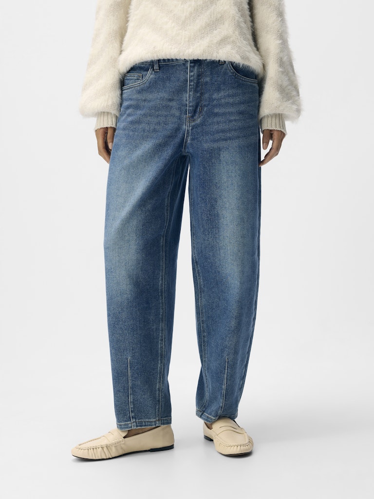 Medium blue washed jeans with a subtle barrel shape.