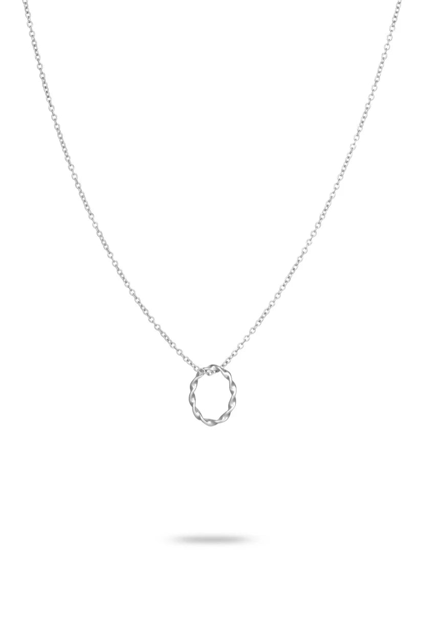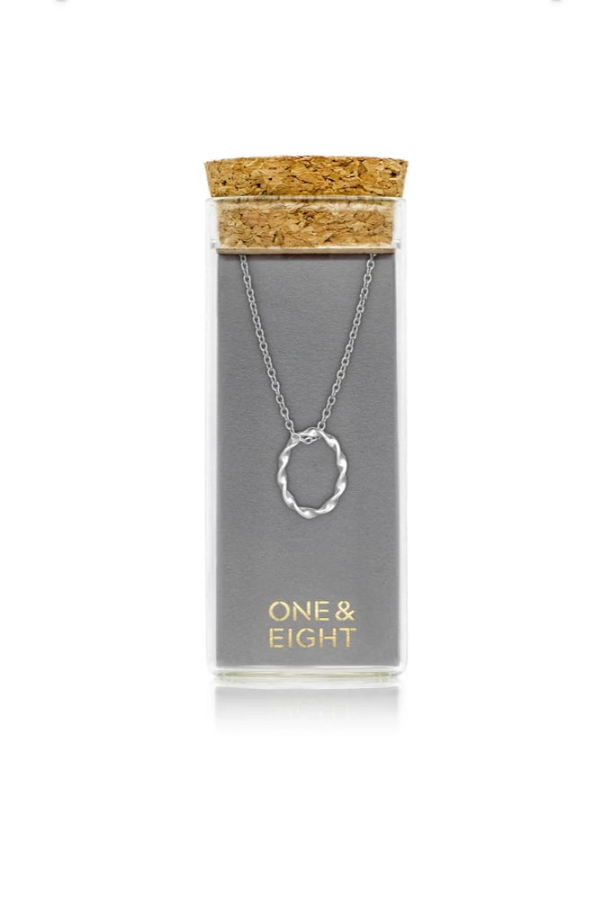 The modern silver twist hoop necklace is perfect for every day wear and comes beautifully packaged in a glass bottle.