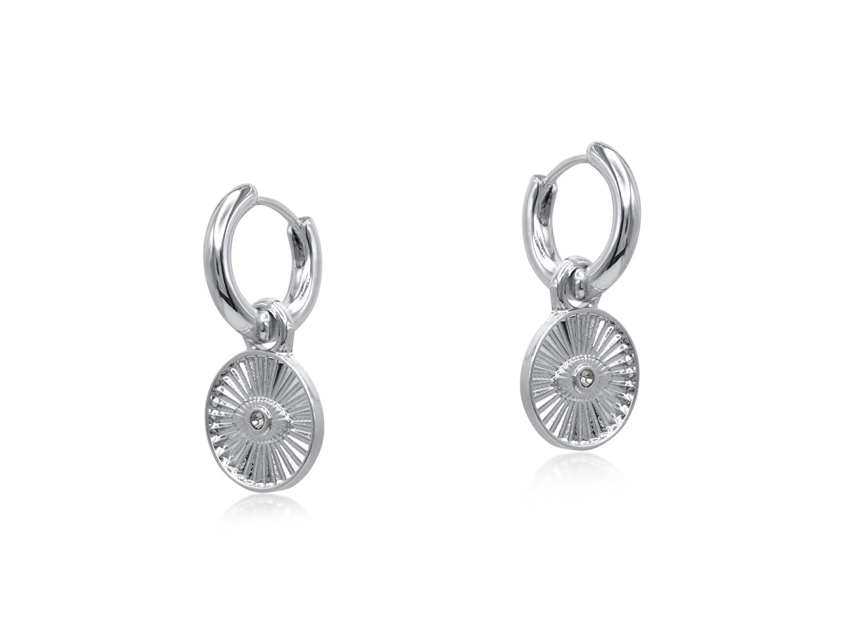 These handcrafted Siren’s Eye Huggies feature a textured silver charm with a radiant eye design and a subtle crystal centre.