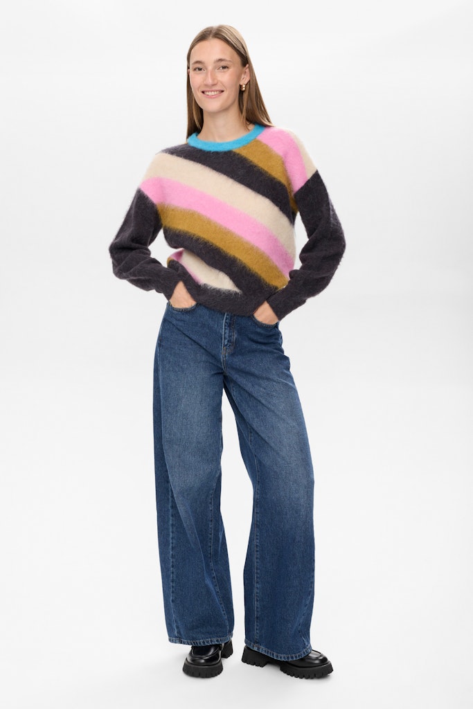 A lovely alpaca / wool blend jumper, in a multi coloured diagonal stripe.