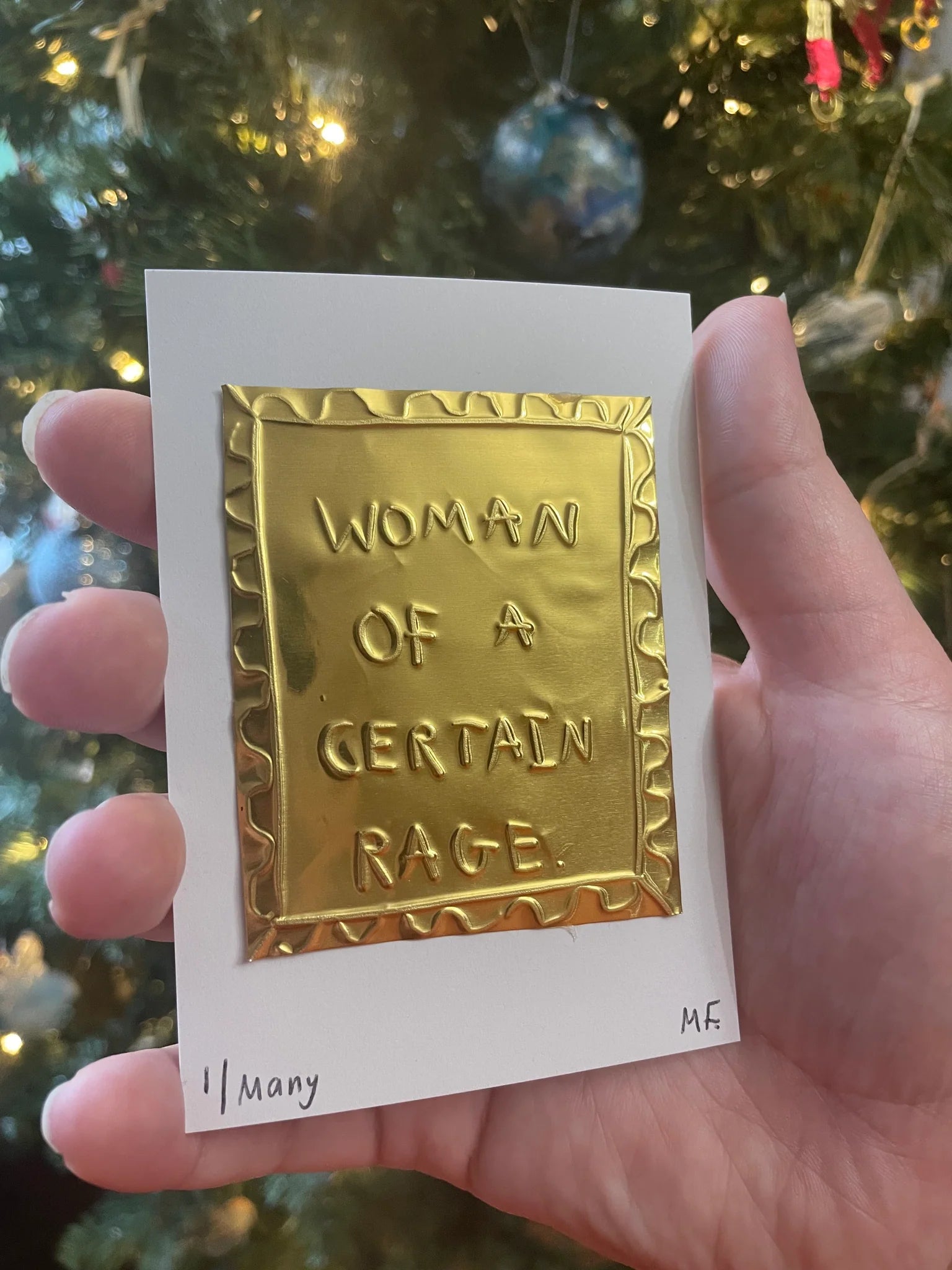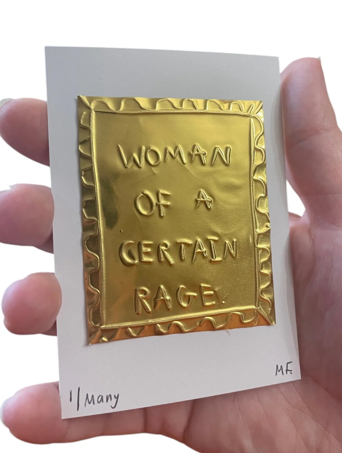 A hand embossed artwork featuring the text 'Woman Of A Certain Rage' on gold coloured tin, mounted on an A7 white cardstock.